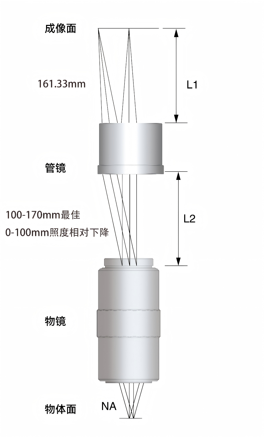 长度L2物镜距离管镜距离100-170mm最佳,0-100mm相对照度会下降