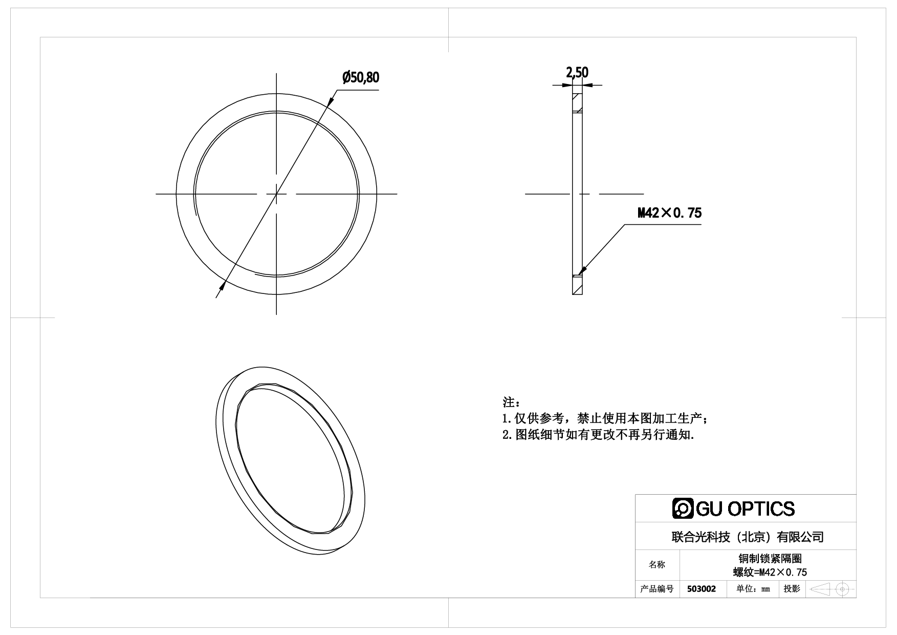 铜制紧锁隔圈(Threaded Brass Retainer Ring)可以和调焦部件及延长筒配合使用,可以方便地调节光学元件的轴向位置。在调整到位后,拧紧锁紧圈便可以锁定准确的调整位置。