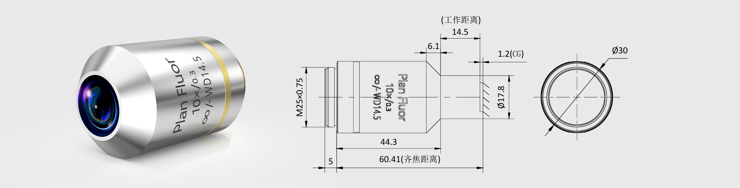 新品 10× 齐焦60mm平场半复消色差倒置生物物镜