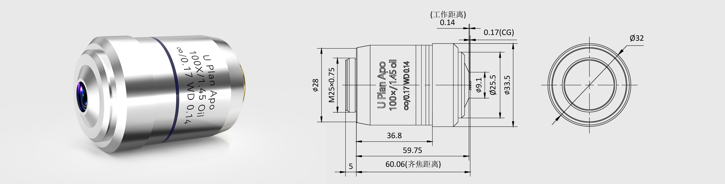 新品 100× 齐焦60mm平场复消色差生物物镜