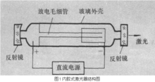 放电毛细管内充以氦氖混合气体,其气压比为 5∶1到10∶1,总压强为133.3~266.6帕(1~2 毫米汞柱)。激光工作物质是氖,起受激辐射作用,氦为辅助气体,起传递能量作用。放电管的阳极一般用钨棒制成,阴极为铝或钼圆筒。