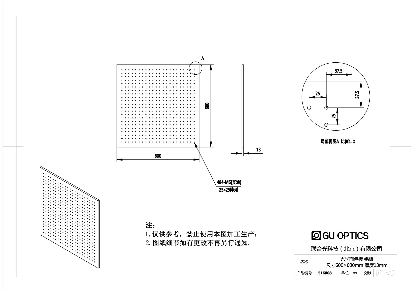 联合光科生产的平板(Aluminum Breadboard)采用铝合金精加工而成,重量轻,容易搬动,面阵列的标准孔距螺纹孔便于固定各种调整架,低反射黑色阳极氧化处理表面,美观耐用,我们接受特殊规格,特殊材料定做,为您定制满足您使用要求的光学平板,如您有任何问题或需求,都可以联系我们,我们将竭诚为您服务。