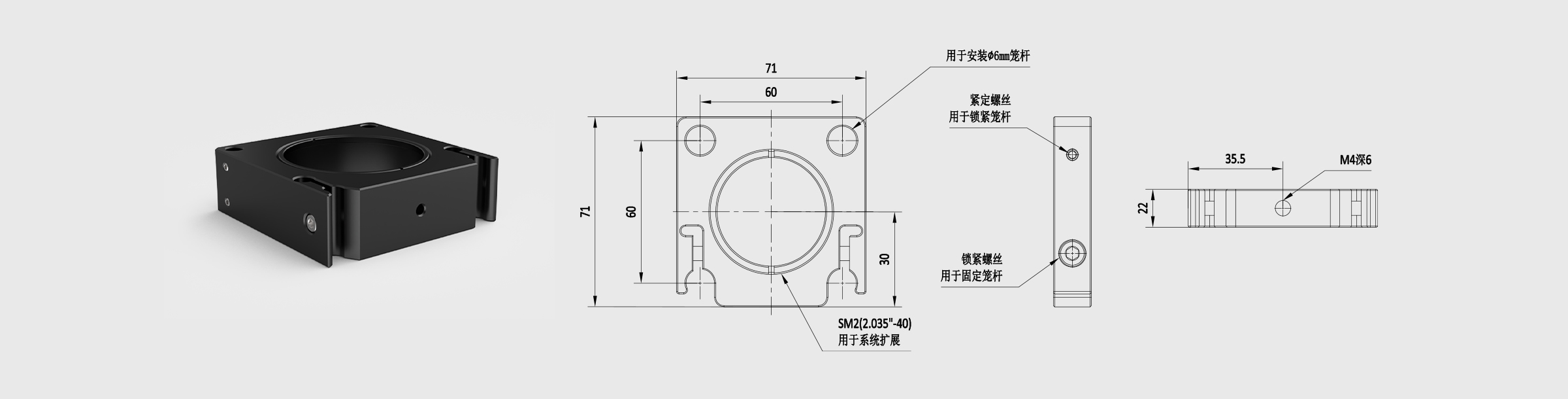 联合光科60mm笼式段式笼板可安装Φ4mm和Φ6mm大小的笼杆,附带两个SM2卡圈用于安装尺寸50.8mm的光学元件。通过挠性锁设计,可快速拆卸笼段,用于搭建可拆卸式的笼段,适用于60mm笼式系统。