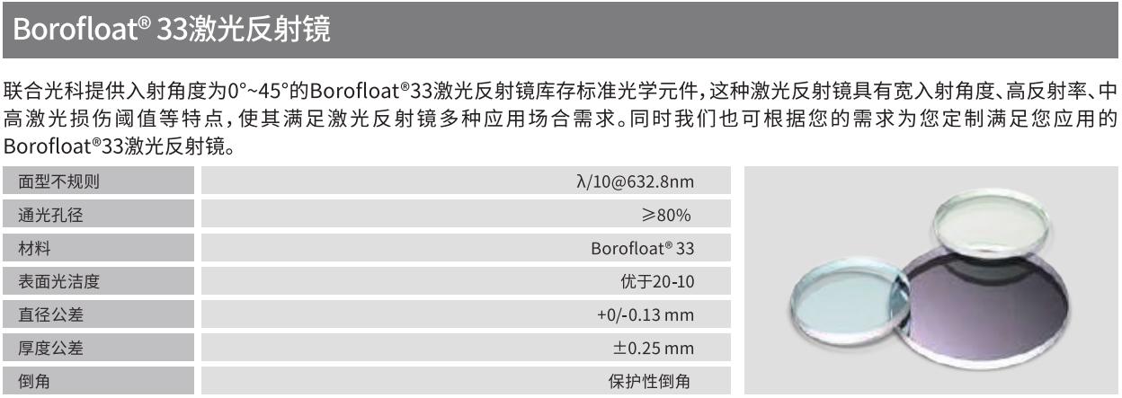 经过100多年的发展,肖特玻璃被广泛应用于包括生物疫苗的各行各业,在光学行业肖特玻璃更是应用到了激光光学,生物光学,机器视觉,计量光学等各个细分领域。使用肖特玻璃制作的光学元件更是高品质的代名词。联合光科也推出了使用肖特Zerodur,Borofloat材料制作的激光反射镜,具有更宽光谱范围、更大入射角度、更高反射率等特点,使其满足多种激光应用场合需求。