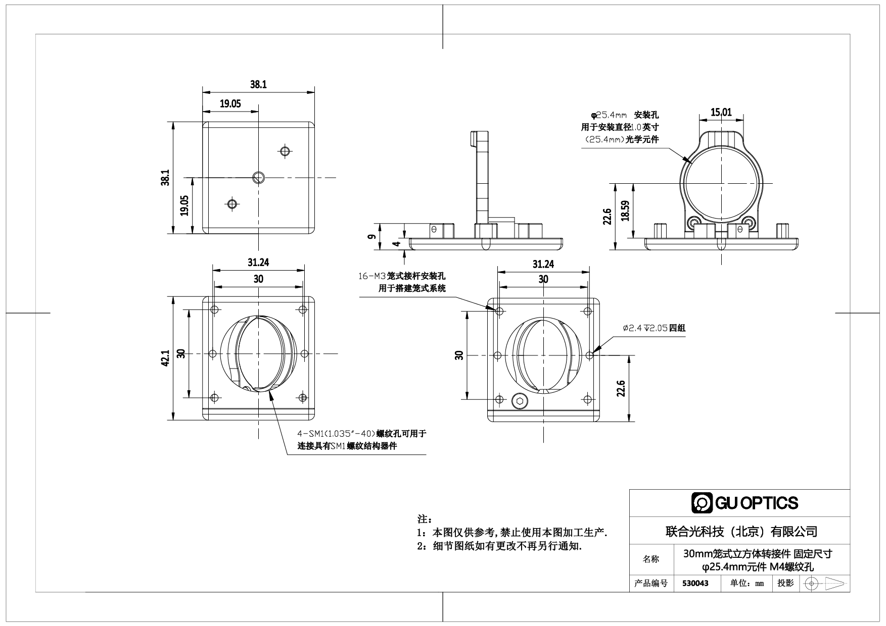 2. 530041、530043适用于安装Φ25.4mm光学元件,45°安装,安装台阶45°对齐;