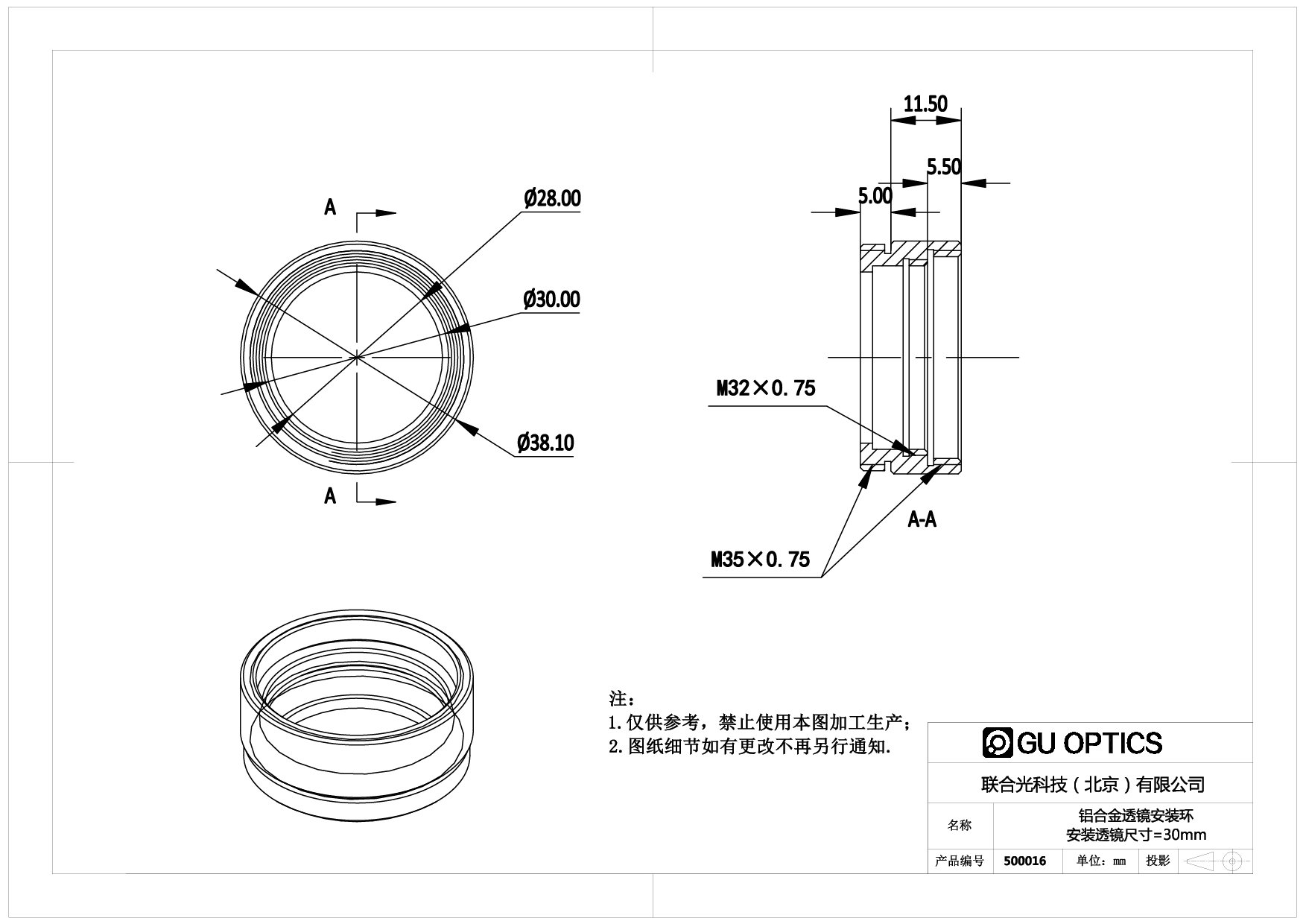 透镜安装环 Ø38.1mm L=11.5mm 螺纹接口-M35x0.75