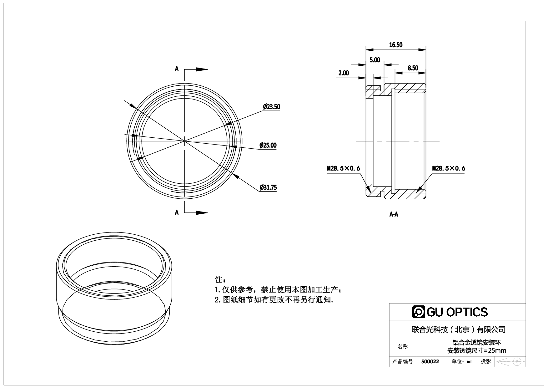 透镜安装环 Ø31.75mm L=11.5mm 螺纹接口-M28.5x0.6