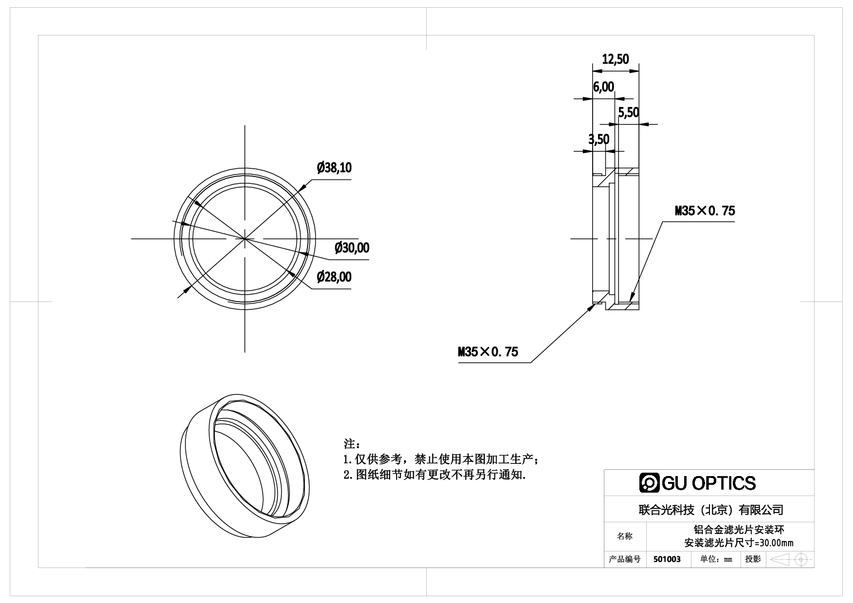 滤光片安装环 Ø38.1mm L=9mm 螺纹接口-M35x0.75