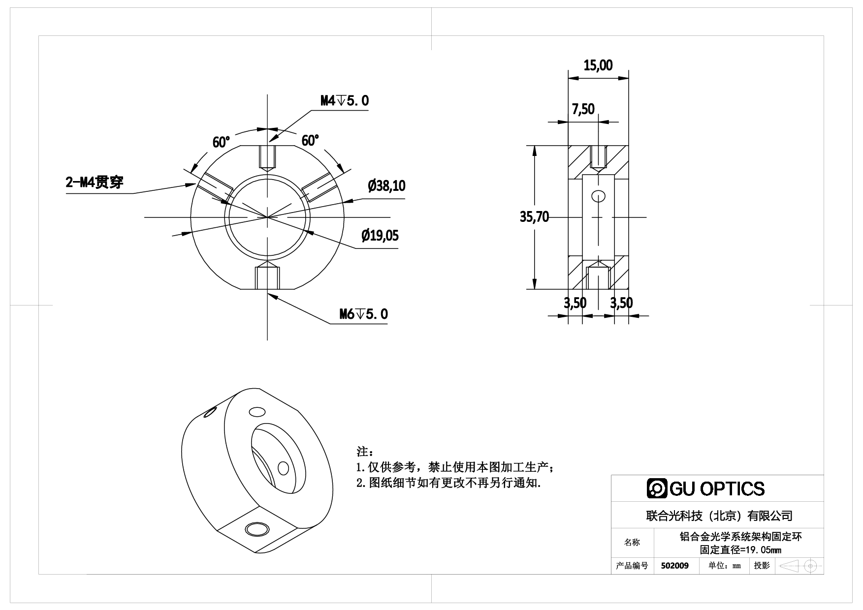 联合光科提供的架构固定环配有标M4及M6螺孔用于和光具座接杆连接。所有架构固定环都是CNC数控中心加密而成,具有极高的尺寸精度以及良好的同心度和垂直度。由于光桥系统的设计特点,多个或成组光学元件可以安装在同一个接杆顶部,同时保证光学元件之间的同轴精度。由于减少了独立调整平台及杆架的使用数量,使用者可以节约各独立调整平台及杆架所需的安装空间,是的整个光学实验系统变得更加紧凑。