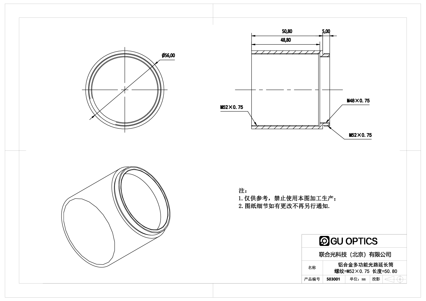 多功能光路延长筒(Multi Purpose Extension Tube)用于光路中,可以方便调整光学器件的空间间隔,配合调焦部件,更可以实现不同光学部件间隔的精密调整。联合光科技提供的多功能光路延长筒内部都有精密车制的标准螺纹,双端都有标准螺纹接口用于和光桥系统所有其他产品的互联。所有多功能光路延长筒内部都有精密车制的标准螺纹,同时双端都有标准螺纹接口用于和光桥系统所有其他产品的互连。 当多功能光路延长筒仅用于延长光路使用时,其内部精密螺纹结构起到消光作用,为光路中杂散光的消除提供了极大的帮助,同时也彻底排除了外界杂散光对光学系统的干扰。当多功能光路延长筒和安装压圈配合使用时,可以将各种标准口径的光学元件安装并固定在延长筒内部。这样为使用者提供了方便且经济的办法,用于镜头原型的设计及试验,或用于复杂光学系统的建立。
