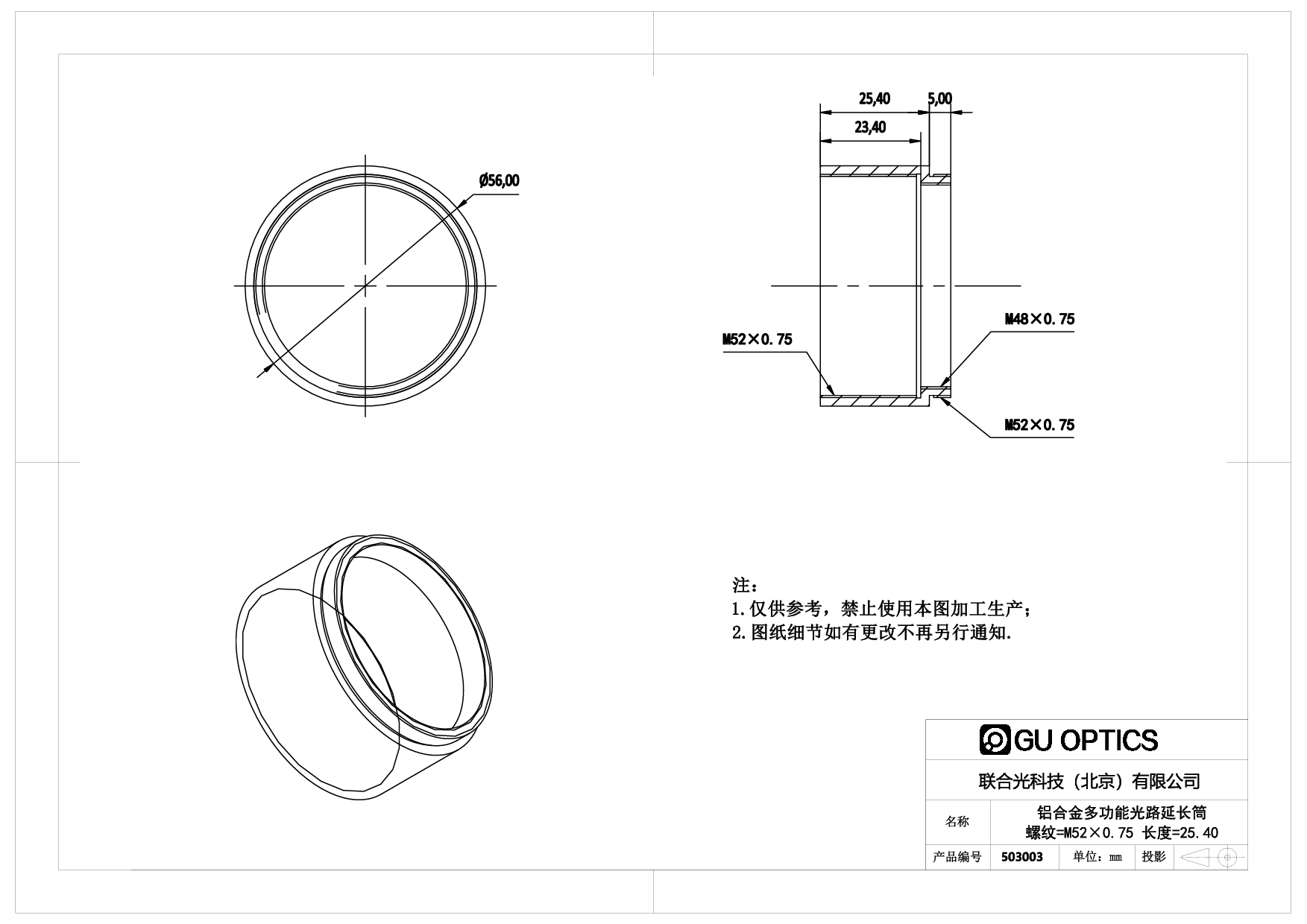 多功能光路延长筒(Multi Purpose Extension Tube)用于光路中,可以方便调整光学器件的空间间隔,配合调焦部件,更可以实现不同光学部件间隔的精密调整。联合光科技提供的多功能光路延长筒内部都有精密车制的标准螺纹,双端都有标准螺纹接口用于和光桥系统所有其他产品的互联。所有多功能光路延长筒内部都有精密车制的标准螺纹,同时双端都有标准螺纹接口用于和光桥系统所有其他产品的互连。 当多功能光路延长筒仅用于延长光路使用时,其内部精密螺纹结构起到消光作用,为光路中杂散光的消除提供了极大的帮助,同时也彻底排除了外界杂散光对光学系统的干扰。当多功能光路延长筒和安装压圈配合使用时,可以将各种标准口径的光学元件安装并固定在延长筒内部。这样为使用者提供了方便且经济的办法,用于镜头原型的设计及试验,或用于复杂光学系统的建立。