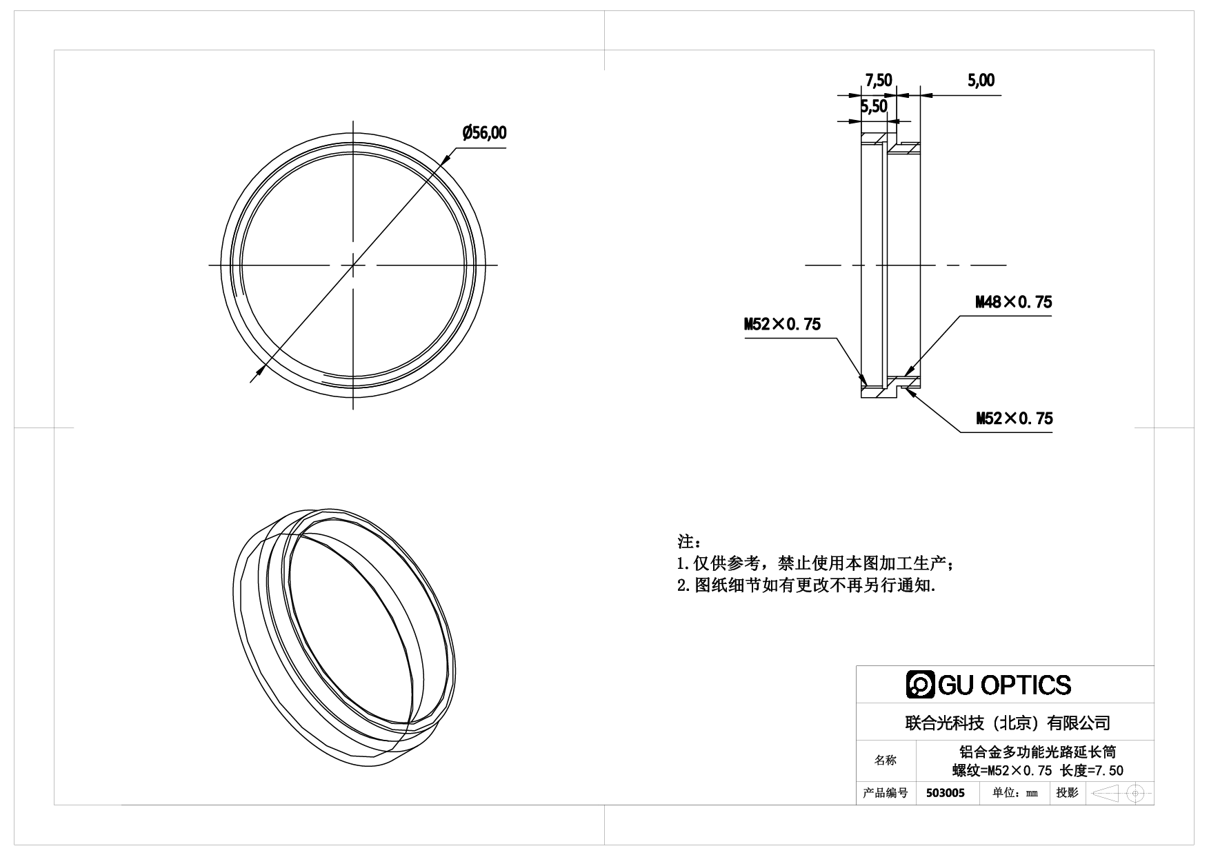 多功能光路延长筒(Multi Purpose Extension Tube)用于光路中,可以方便调整光学器件的空间间隔,配合调焦部件,更可以实现不同光学部件间隔的精密调整。联合光科技提供的多功能光路延长筒内部都有精密车制的标准螺纹,双端都有标准螺纹接口用于和光桥系统所有其他产品的互联。所有多功能光路延长筒内部都有精密车制的标准螺纹,同时双端都有标准螺纹接口用于和光桥系统所有其他产品的互连。 当多功能光路延长筒仅用于延长光路使用时,其内部精密螺纹结构起到消光作用,为光路中杂散光的消除提供了极大的帮助,同时也彻底排除了外界杂散光对光学系统的干扰。当多功能光路延长筒和安装压圈配合使用时,可以将各种标准口径的光学元件安装并固定在延长筒内部。这样为使用者提供了方便且经济的办法,用于镜头原型的设计及试验,或用于复杂光学系统的建立。