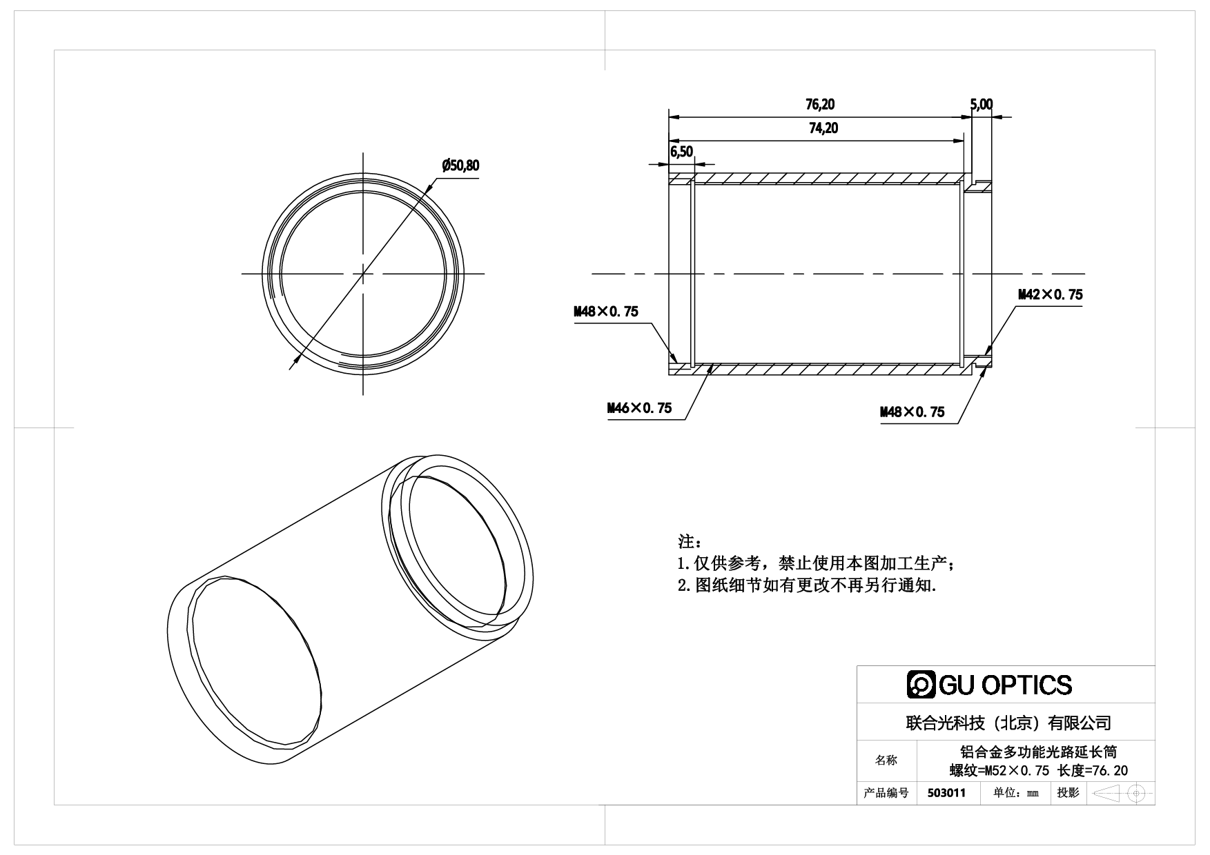多功能光路延长筒(Multi Purpose Extension Tube)用于光路中,可以方便调整光学器件的空间间隔,配合调焦部件,更可以实现不同光学部件间隔的精密调整。联合光科技提供的多功能光路延长筒内部都有精密车制的标准螺纹,双端都有标准螺纹接口用于和光桥系统所有其他产品的互联。所有多功能光路延长筒内部都有精密车制的标准螺纹,同时双端都有标准螺纹接口用于和光桥系统所有其他产品的互连。 当多功能光路延长筒仅用于延长光路使用时,其内部精密螺纹结构起到消光作用,为光路中杂散光的消除提供了极大的帮助,同时也彻底排除了外界杂散光对光学系统的干扰。当多功能光路延长筒和安装压圈配合使用时,可以将各种标准口径的光学元件安装并固定在延长筒内部。这样为使用者提供了方便且经济的办法,用于镜头原型的设计及试验,或用于复杂光学系统的建立。