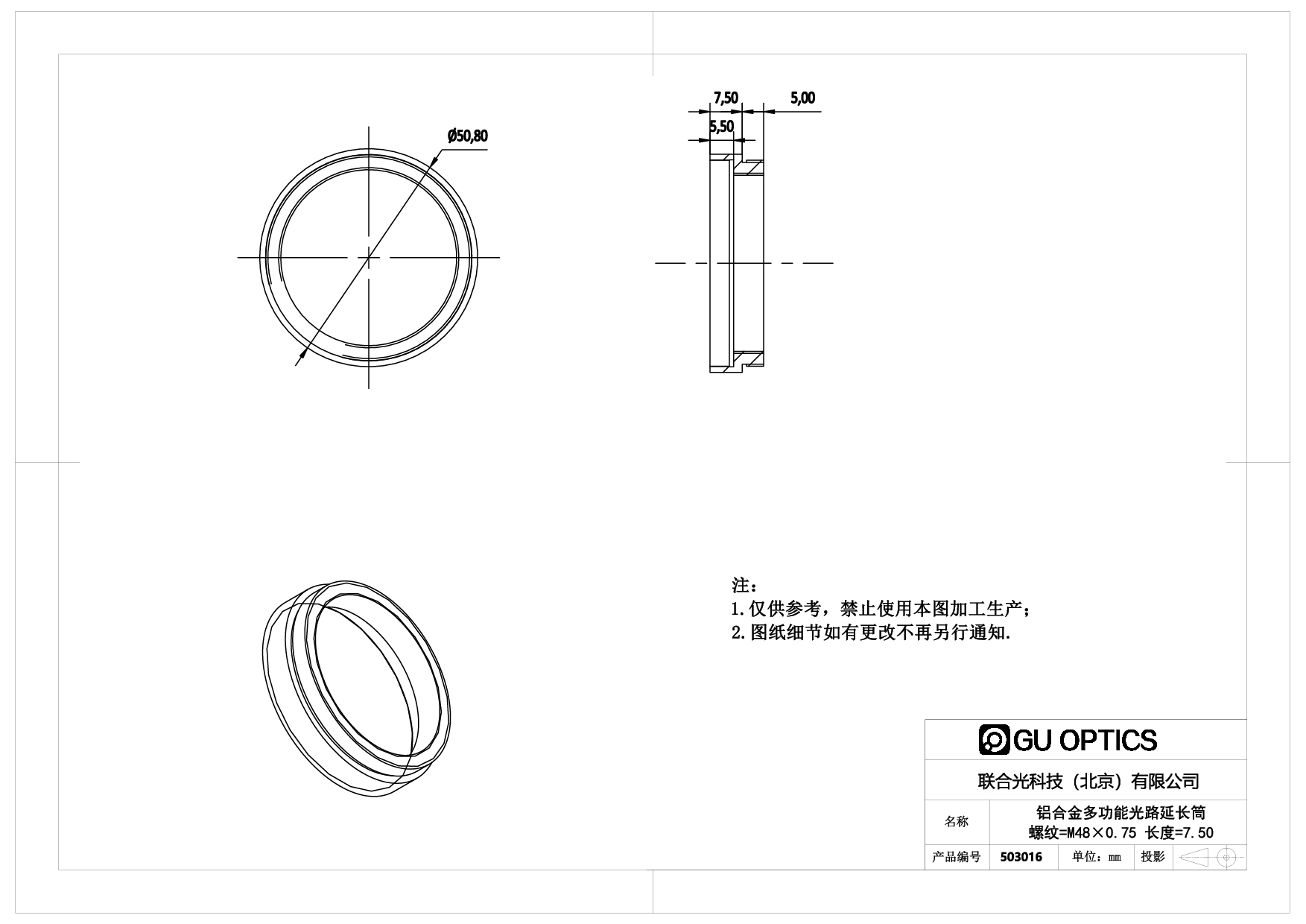 多功能光路延长筒(Multi Purpose Extension Tube)用于光路中,可以方便调整光学器件的空间间隔,配合调焦部件,更可以实现不同光学部件间隔的精密调整。联合光科技提供的多功能光路延长筒内部都有精密车制的标准螺纹,双端都有标准螺纹接口用于和光桥系统所有其他产品的互联。所有多功能光路延长筒内部都有精密车制的标准螺纹,同时双端都有标准螺纹接口用于和光桥系统所有其他产品的互连。 当多功能光路延长筒仅用于延长光路使用时,其内部精密螺纹结构起到消光作用,为光路中杂散光的消除提供了极大的帮助,同时也彻底排除了外界杂散光对光学系统的干扰。当多功能光路延长筒和安装压圈配合使用时,可以将各种标准口径的光学元件安装并固定在延长筒内部。这样为使用者提供了方便且经济的办法,用于镜头原型的设计及试验,或用于复杂光学系统的建立。