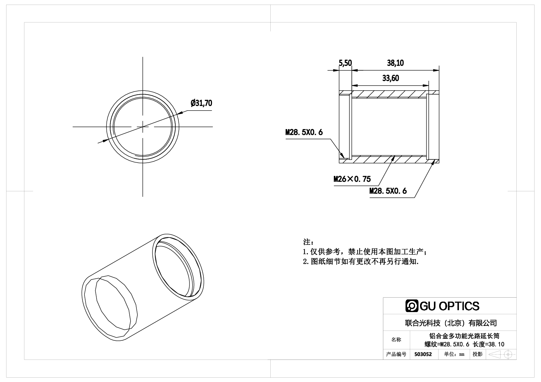 多功能光路延长筒(Multi Purpose Extension Tube)用于光路中,可以方便调整光学器件的空间间隔,配合调焦部件,更可以实现不同光学部件间隔的精密调整。联合光科技提供的多功能光路延长筒内部都有精密车制的标准螺纹,双端都有标准螺纹接口用于和光桥系统所有其他产品的互联。所有多功能光路延长筒内部都有精密车制的标准螺纹,同时双端都有标准螺纹接口用于和光桥系统所有其他产品的互连。 当多功能光路延长筒仅用于延长光路使用时,其内部精密螺纹结构起到消光作用,为光路中杂散光的消除提供了极大的帮助,同时也彻底排除了外界杂散光对光学系统的干扰。当多功能光路延长筒和安装压圈配合使用时,可以将各种标准口径的光学元件安装并固定在延长筒内部。这样为使用者提供了方便且经济的办法,用于镜头原型的设计及试验,或用于复杂光学系统的建立。