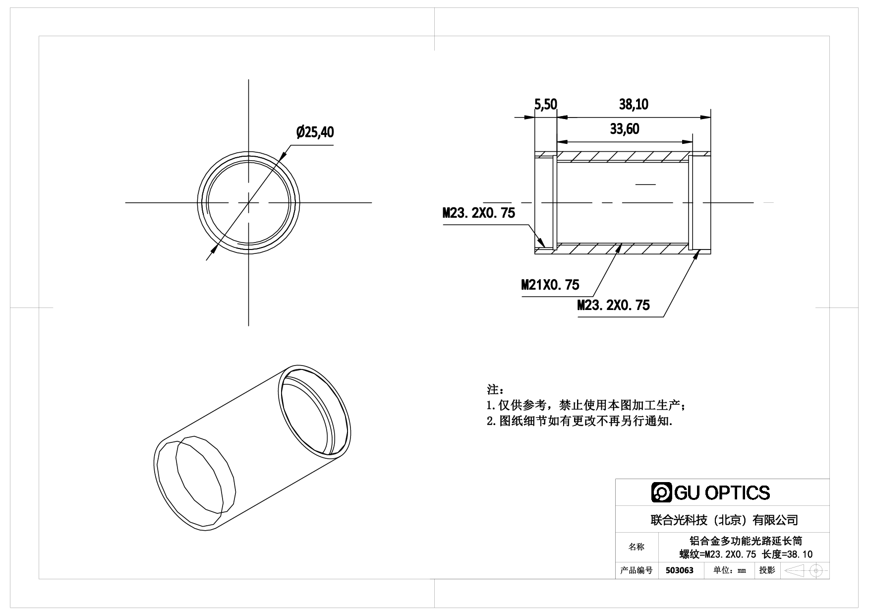 多功能光路延长筒 Ø25.4mm L=38.1mm