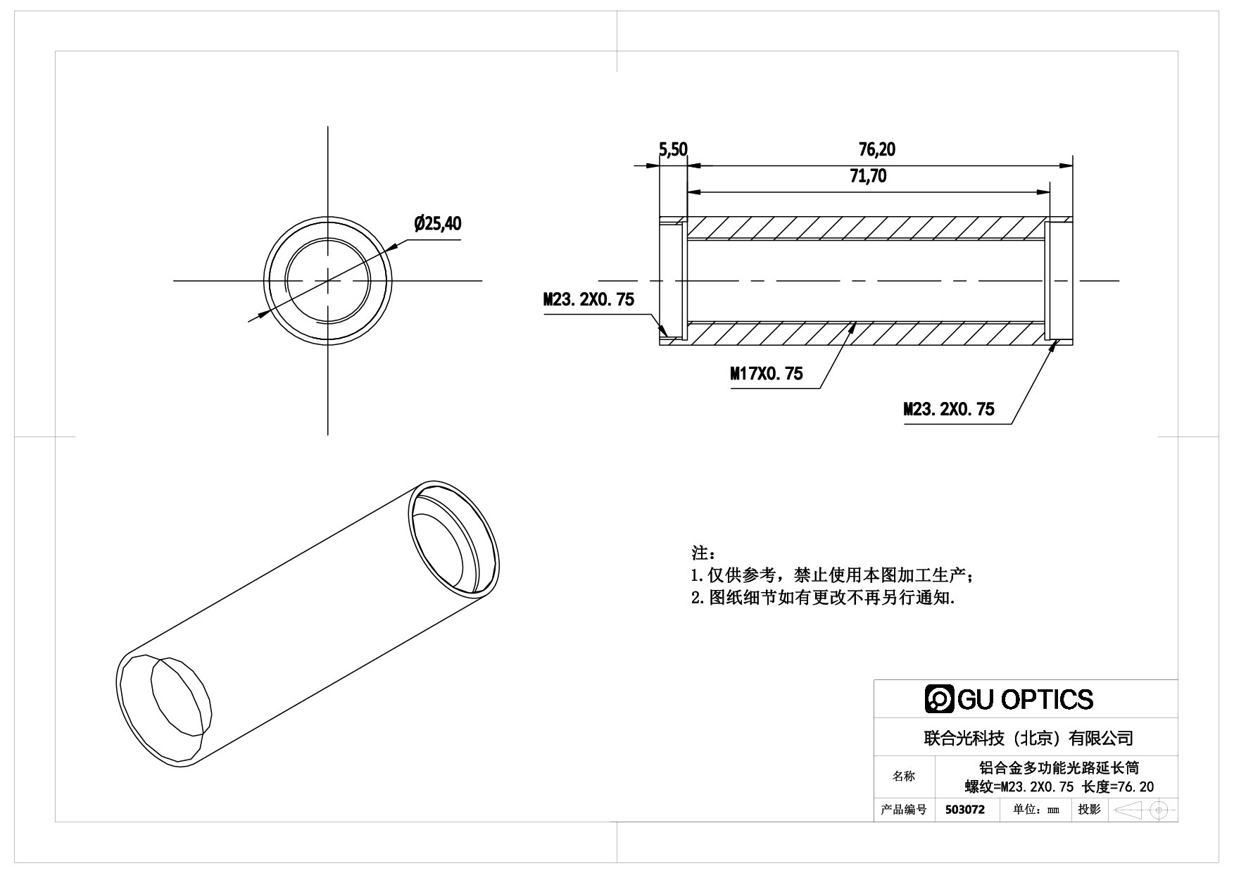 多功能光路延长筒(Multi Purpose Extension Tube)用于光路中,可以方便调整光学器件的空间间隔,配合调焦部件,更可以实现不同光学部件间隔的精密调整。联合光科技提供的多功能光路延长筒内部都有精密车制的标准螺纹,双端都有标准螺纹接口用于和光桥系统所有其他产品的互联。所有多功能光路延长筒内部都有精密车制的标准螺纹,同时双端都有标准螺纹接口用于和光桥系统所有其他产品的互连。 当多功能光路延长筒仅用于延长光路使用时,其内部精密螺纹结构起到消光作用,为光路中杂散光的消除提供了极大的帮助,同时也彻底排除了外界杂散光对光学系统的干扰。当多功能光路延长筒和安装压圈配合使用时,可以将各种标准口径的光学元件安装并固定在延长筒内部。这样为使用者提供了方便且经济的办法,用于镜头原型的设计及试验,或用于复杂光学系统的建立。