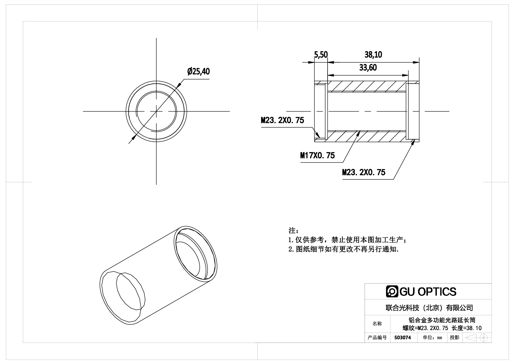 多功能光路延长筒 Ø25.4mm L=38.1mm