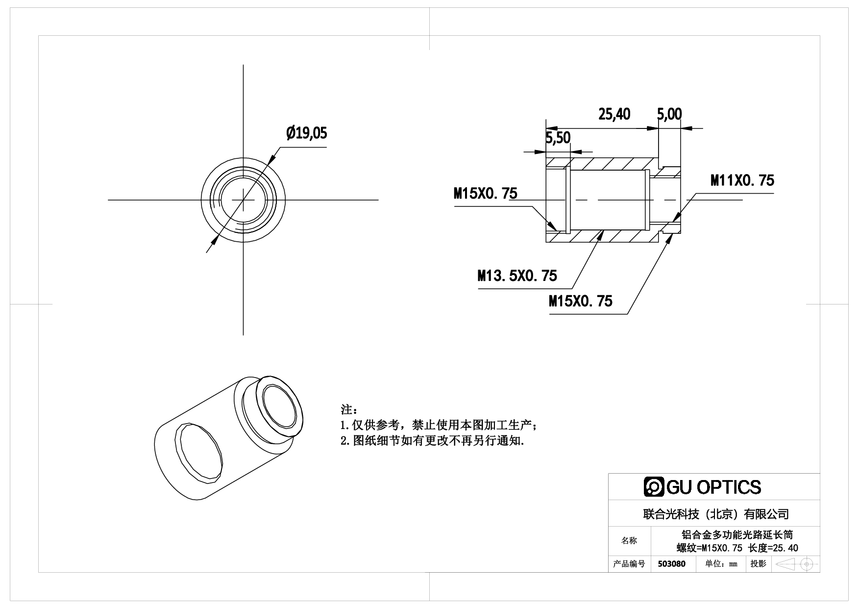 多功能光路延长筒(Multi Purpose Extension Tube)用于光路中,可以方便调整光学器件的空间间隔,配合调焦部件,更可以实现不同光学部件间隔的精密调整。联合光科技提供的多功能光路延长筒内部都有精密车制的标准螺纹,双端都有标准螺纹接口用于和光桥系统所有其他产品的互联。所有多功能光路延长筒内部都有精密车制的标准螺纹,同时双端都有标准螺纹接口用于和光桥系统所有其他产品的互连。 当多功能光路延长筒仅用于延长光路使用时,其内部精密螺纹结构起到消光作用,为光路中杂散光的消除提供了极大的帮助,同时也彻底排除了外界杂散光对光学系统的干扰。当多功能光路延长筒和安装压圈配合使用时,可以将各种标准口径的光学元件安装并固定在延长筒内部。这样为使用者提供了方便且经济的办法,用于镜头原型的设计及试验,或用于复杂光学系统的建立。