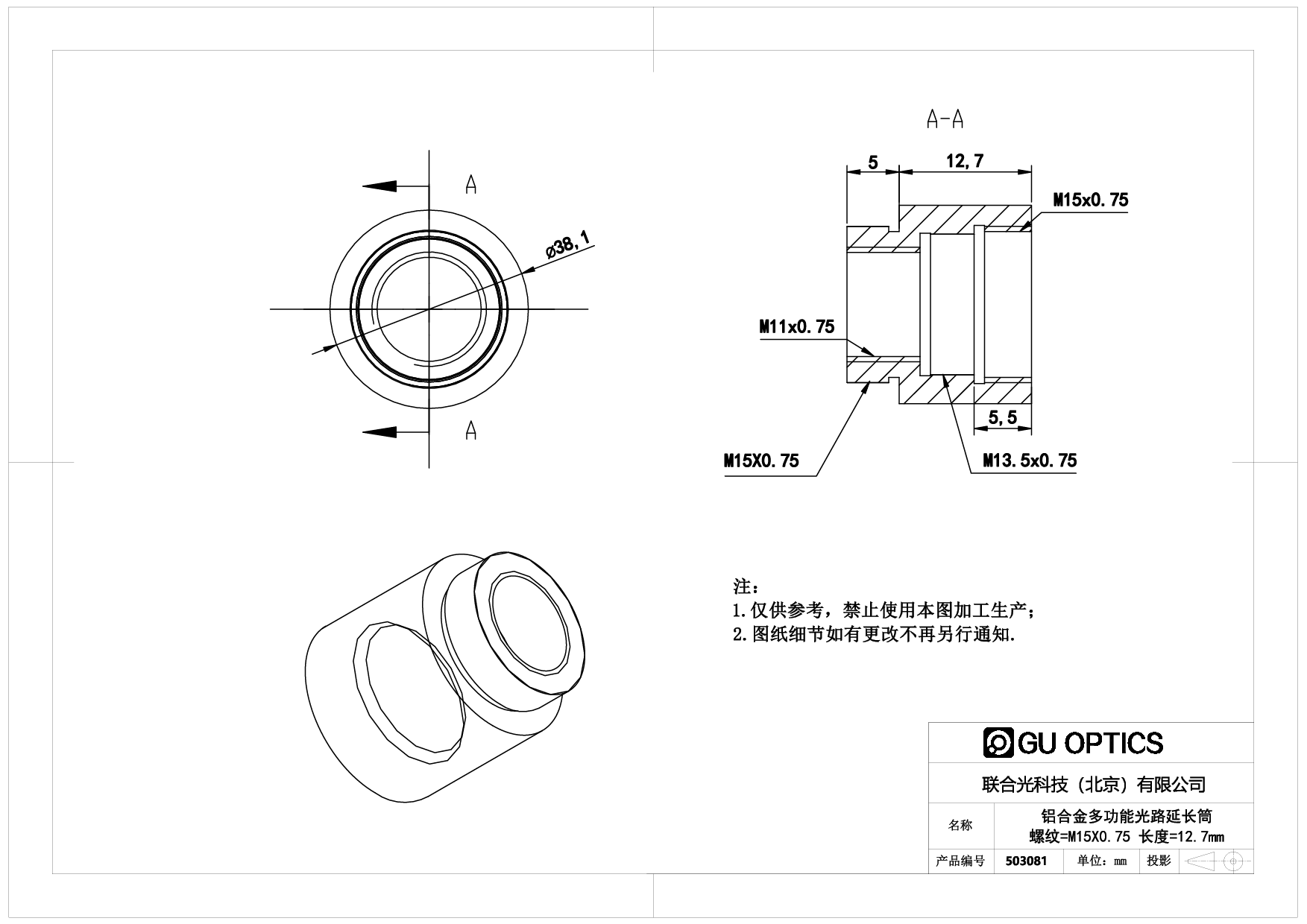 多功能光路延长筒(Multi Purpose Extension Tube)用于光路中,可以方便调整光学器件的空间间隔,配合调焦部件,更可以实现不同光学部件间隔的精密调整。联合光科技提供的多功能光路延长筒内部都有精密车制的标准螺纹,双端都有标准螺纹接口用于和光桥系统所有其他产品的互联。所有多功能光路延长筒内部都有精密车制的标准螺纹,同时双端都有标准螺纹接口用于和光桥系统所有其他产品的互连。 当多功能光路延长筒仅用于延长光路使用时,其内部精密螺纹结构起到消光作用,为光路中杂散光的消除提供了极大的帮助,同时也彻底排除了外界杂散光对光学系统的干扰。当多功能光路延长筒和安装压圈配合使用时,可以将各种标准口径的光学元件安装并固定在延长筒内部。这样为使用者提供了方便且经济的办法,用于镜头原型的设计及试验,或用于复杂光学系统的建立。