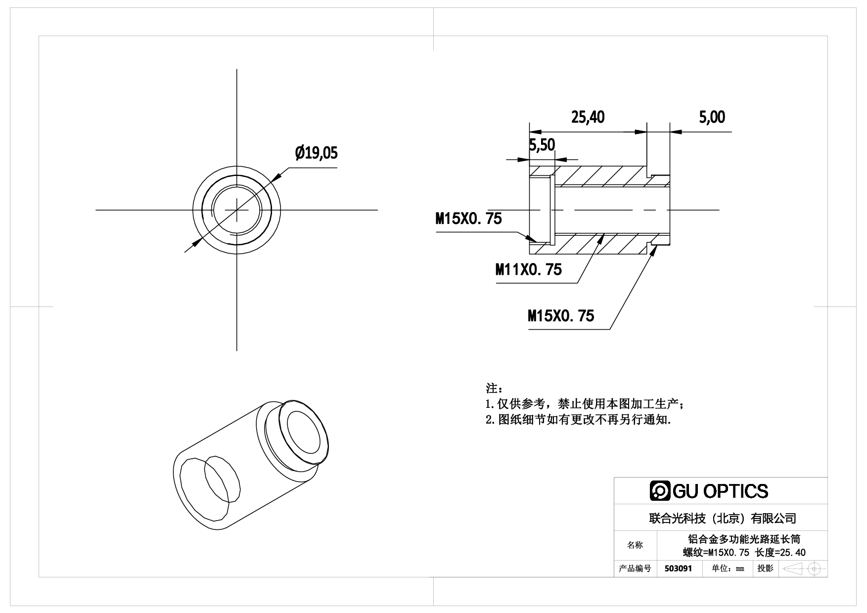 多功能光路延长筒(Multi Purpose Extension Tube)用于光路中,可以方便调整光学器件的空间间隔,配合调焦部件,更可以实现不同光学部件间隔的精密调整。联合光科技提供的多功能光路延长筒内部都有精密车制的标准螺纹,双端都有标准螺纹接口用于和光桥系统所有其他产品的互联。所有多功能光路延长筒内部都有精密车制的标准螺纹,同时双端都有标准螺纹接口用于和光桥系统所有其他产品的互连。 当多功能光路延长筒仅用于延长光路使用时,其内部精密螺纹结构起到消光作用,为光路中杂散光的消除提供了极大的帮助,同时也彻底排除了外界杂散光对光学系统的干扰。当多功能光路延长筒和安装压圈配合使用时,可以将各种标准口径的光学元件安装并固定在延长筒内部。这样为使用者提供了方便且经济的办法,用于镜头原型的设计及试验,或用于复杂光学系统的建立。