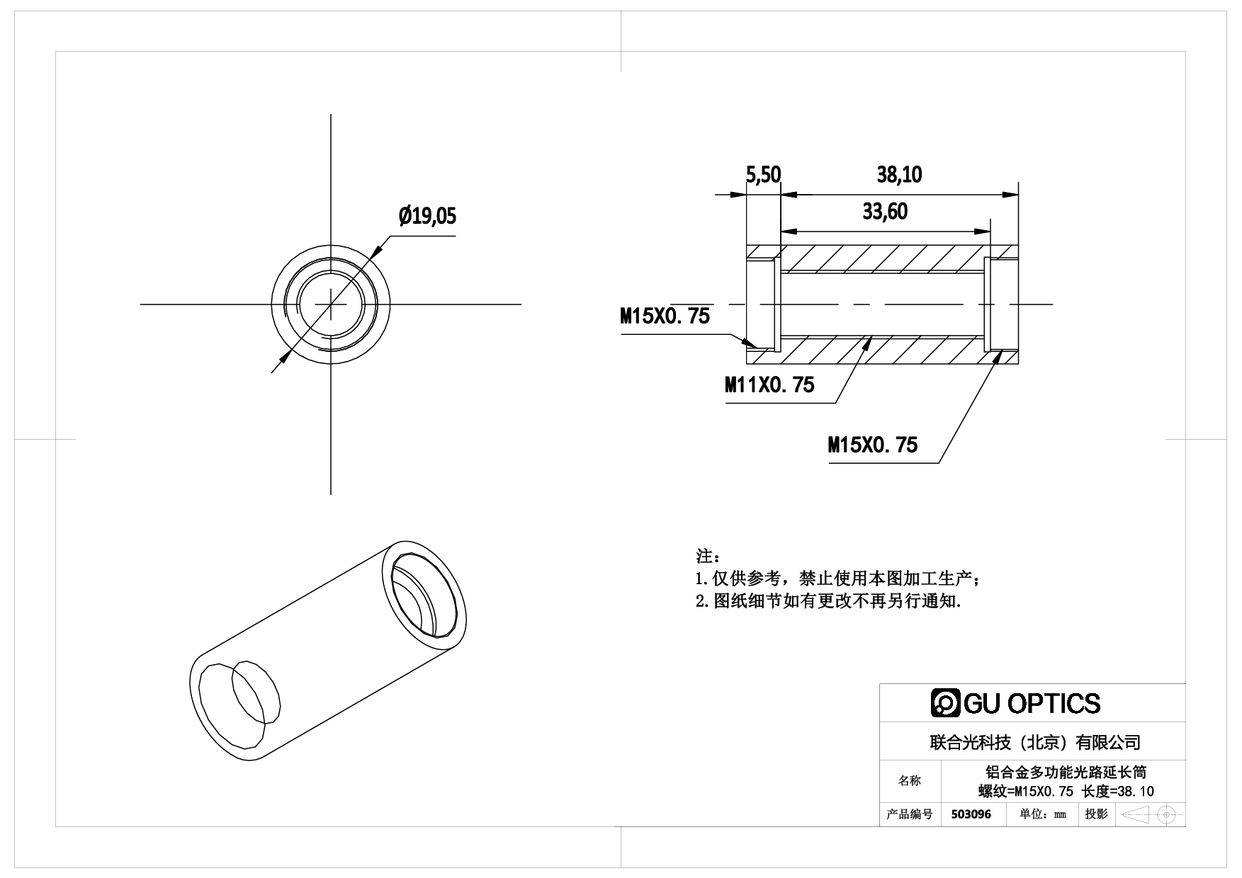 多功能光路延长筒(Multi Purpose Extension Tube)用于光路中,可以方便调整光学器件的空间间隔,配合调焦部件,更可以实现不同光学部件间隔的精密调整。联合光科技提供的多功能光路延长筒内部都有精密车制的标准螺纹,双端都有标准螺纹接口用于和光桥系统所有其他产品的互联。所有多功能光路延长筒内部都有精密车制的标准螺纹,同时双端都有标准螺纹接口用于和光桥系统所有其他产品的互连。 当多功能光路延长筒仅用于延长光路使用时,其内部精密螺纹结构起到消光作用,为光路中杂散光的消除提供了极大的帮助,同时也彻底排除了外界杂散光对光学系统的干扰。当多功能光路延长筒和安装压圈配合使用时,可以将各种标准口径的光学元件安装并固定在延长筒内部。这样为使用者提供了方便且经济的办法,用于镜头原型的设计及试验,或用于复杂光学系统的建立。
