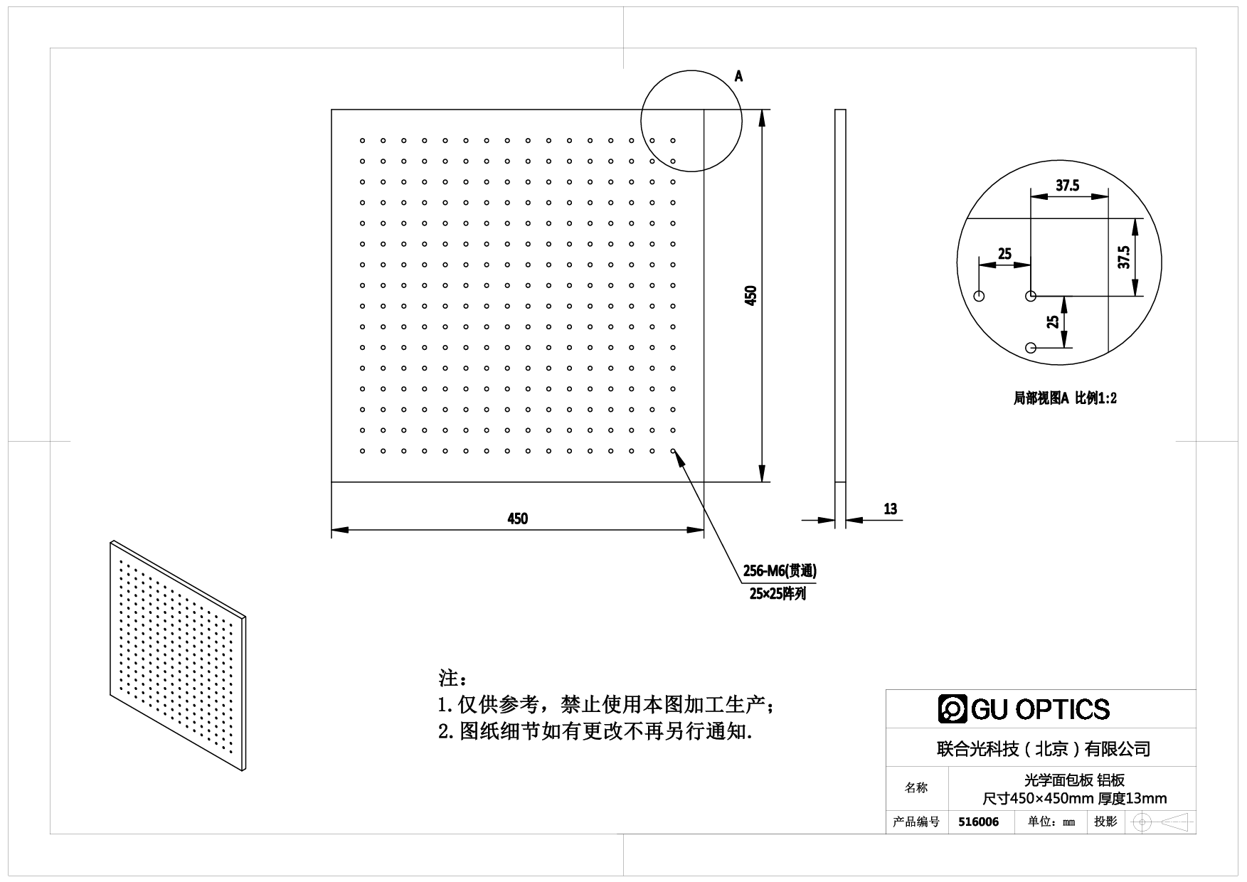 联合光科生产的平板(Aluminum Breadboard)采用铝合金精加工而成,重量轻,容易搬动,面阵列的标准孔距螺纹孔便于固定各种调整架,低反射黑色阳极氧化处理表面,美观耐用,我们接受特殊规格,特殊材料定做,为您定制满足您使用要求的光学平板,如您有任何问题或需求,都可以联系我们,我们将竭诚为您服务。