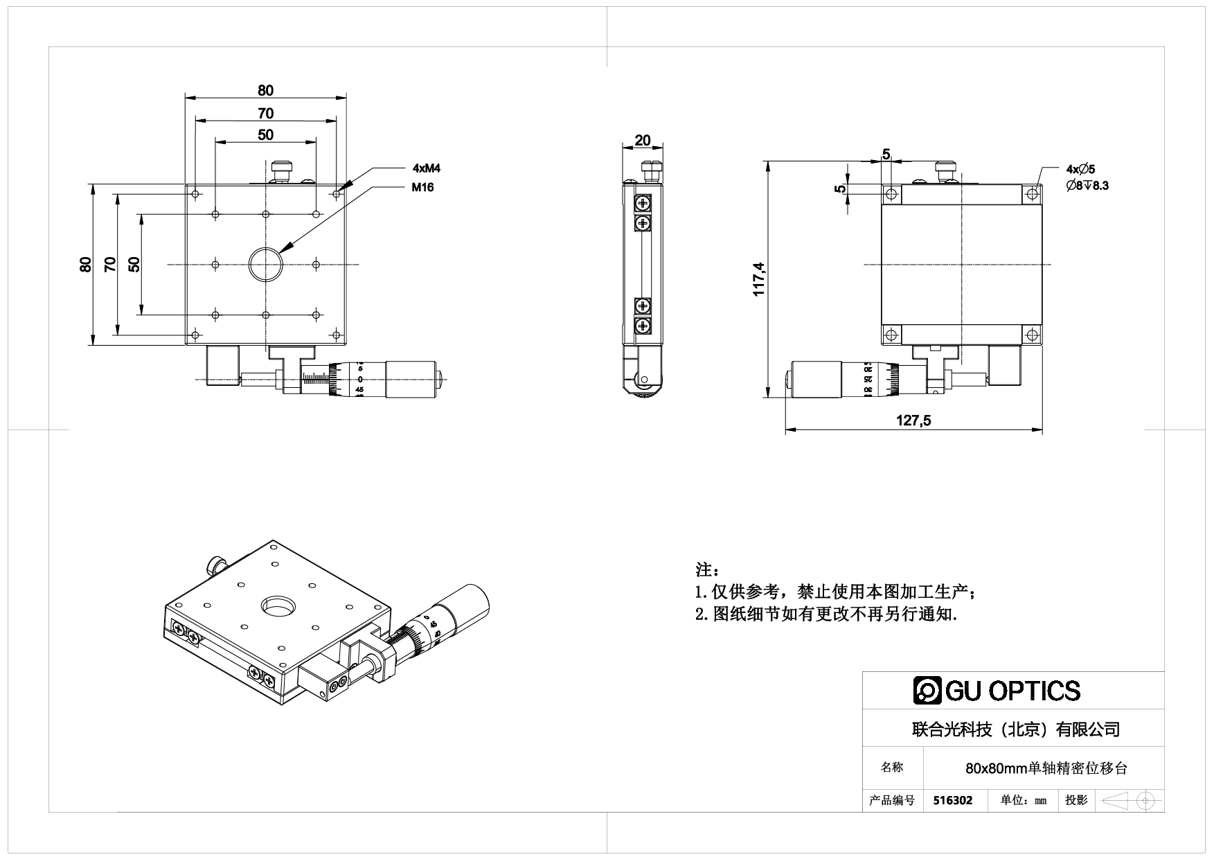 6. 使用测微头(Micrometer head,单位0.01mm)传动,适合高精密精度移动;