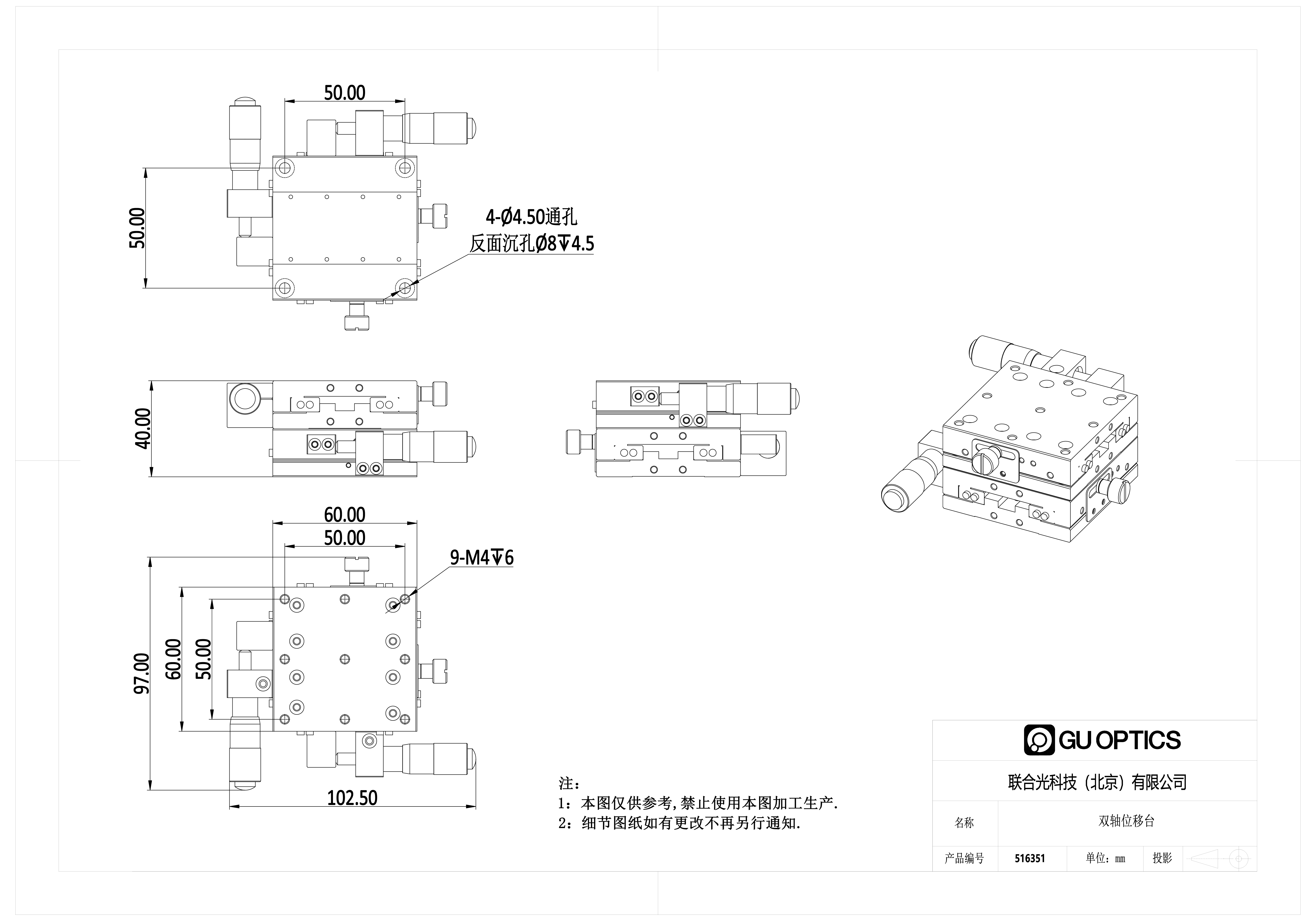 5. 使用测微头(Micrometer head,单位0.01mm)传动,适合高精密精度移动;