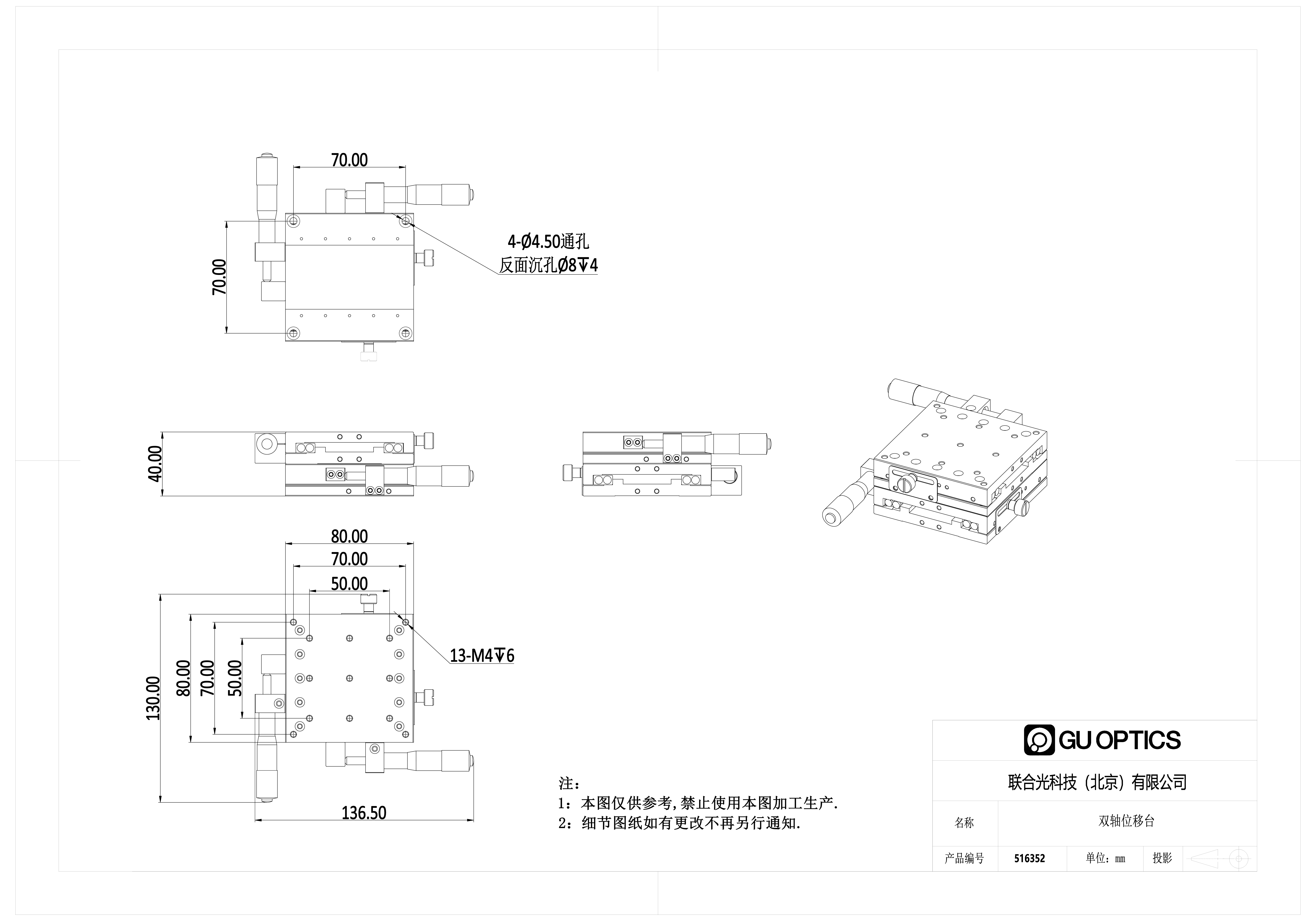 台面尺寸80x80mm 双轴精密位移台