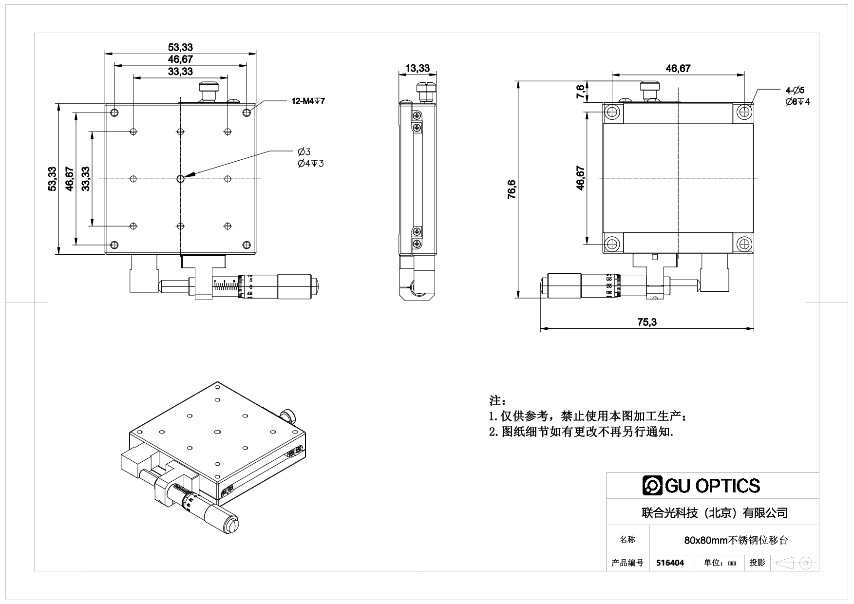 6. 使用测微头(Micrometer head,单位0.01mm)传动,适合高精密精度移动;