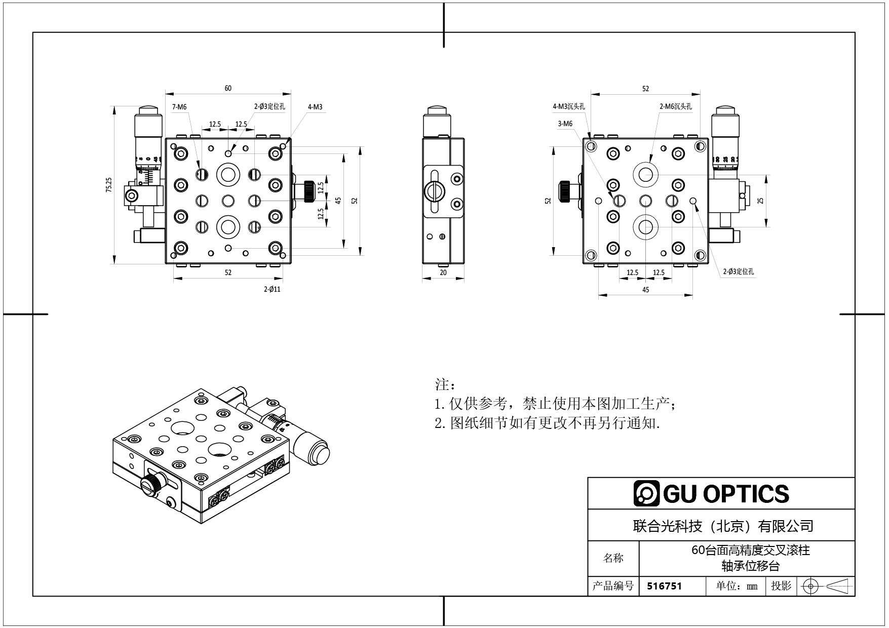 联合光科的高精度交叉滚柱轴承位移台的线性交叉滚柱轴承设计可以提供更大荷重量和更高精确度和直线性的功能,和交叉滚柱轴承接触的轨道由抛光的轴承钢材研磨制成,以确保长期使用的平滑度及精确性,具有M6和M4螺纹牙、螺纹孔洞可方便组合或固定。联合光科提供台面尺寸为40×40mm、60×60mm、80×80mm,行程±6.5 ~±12.5 mm的标准高精度交叉滚柱轴承位移台库存产品供您选择。