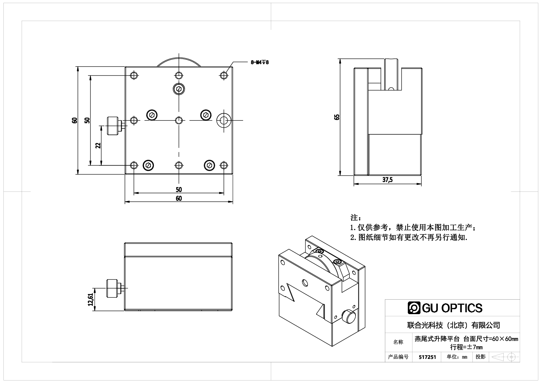 燕尾式升降平台 台面尺寸=60×60mm 行程=7mm
