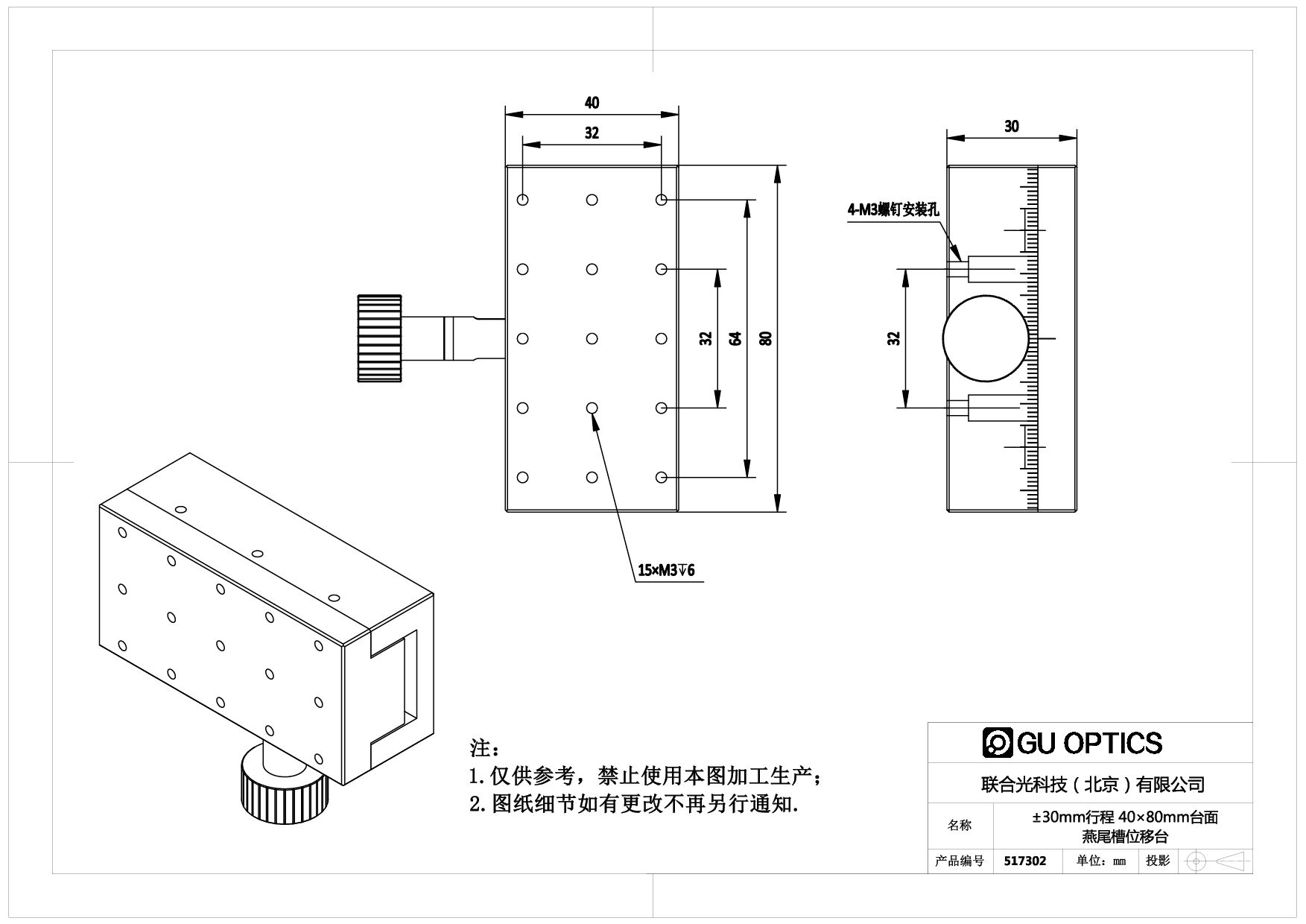 联合光科的燕尾槽位移台为铝合金材质,采用燕尾式导轨设计,使得产品运行速度快,该种燕尾槽位移台适合用于精度要求不高、快速移动的场合。联合光科提供台面尺寸为40×60mm、40×80mm,行程±20 mm、±30 mm的标准燕尾槽位移台库存产品供您选择。517300采用螺纹丝杆驱动,517301、517302采用齿轮齿条驱动。