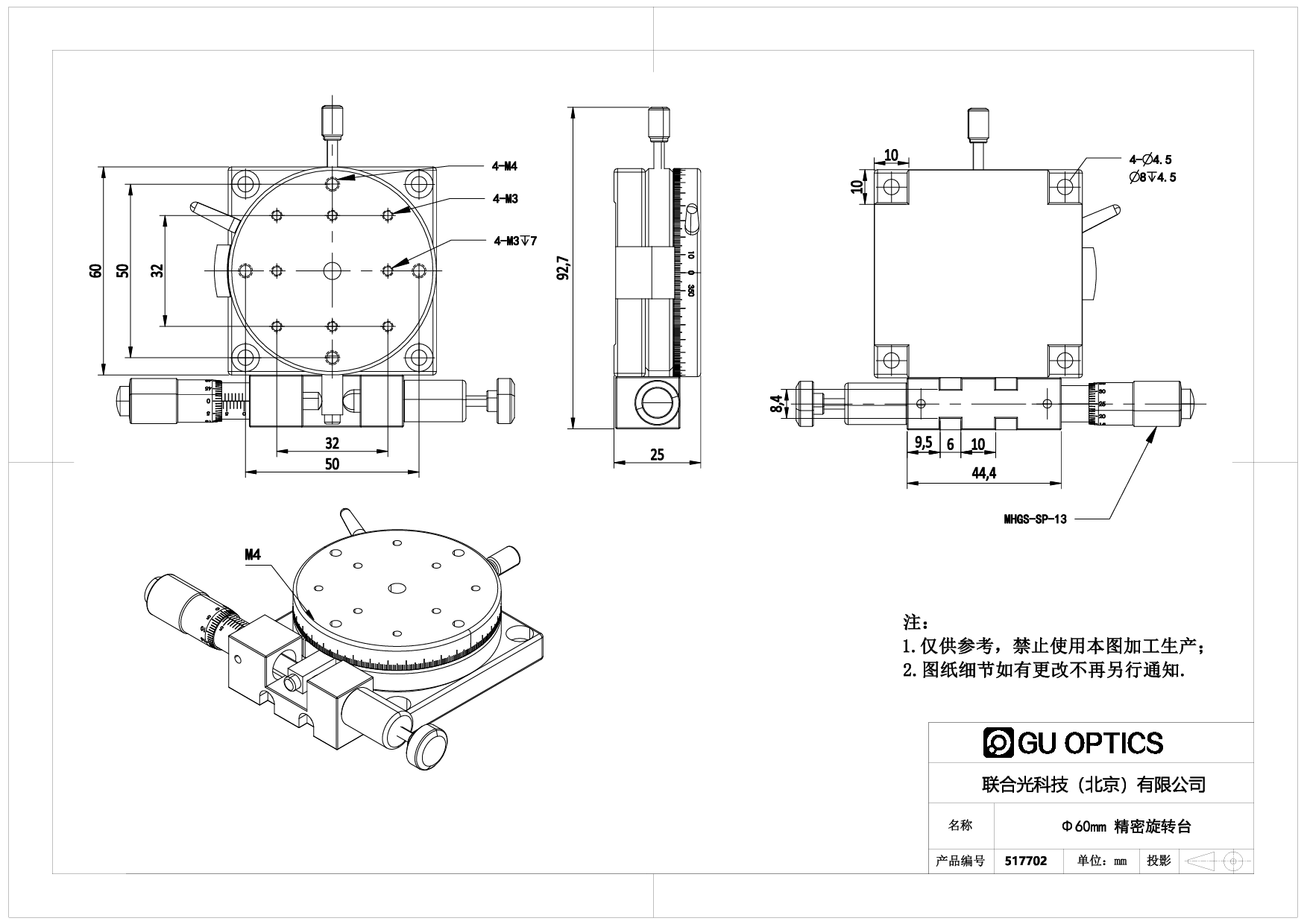 联合光科的精密旋转台为铝合金材质,采用用铜套回转系统传动。联合光科提供台面尺寸为Φ38mm、Φ60mm、Φ85mm,行程360°(粗动)、±5°(微动),使用测微头(Micrometer head,单位0.01mm)传动的精密旋转台库存产品供您选择。