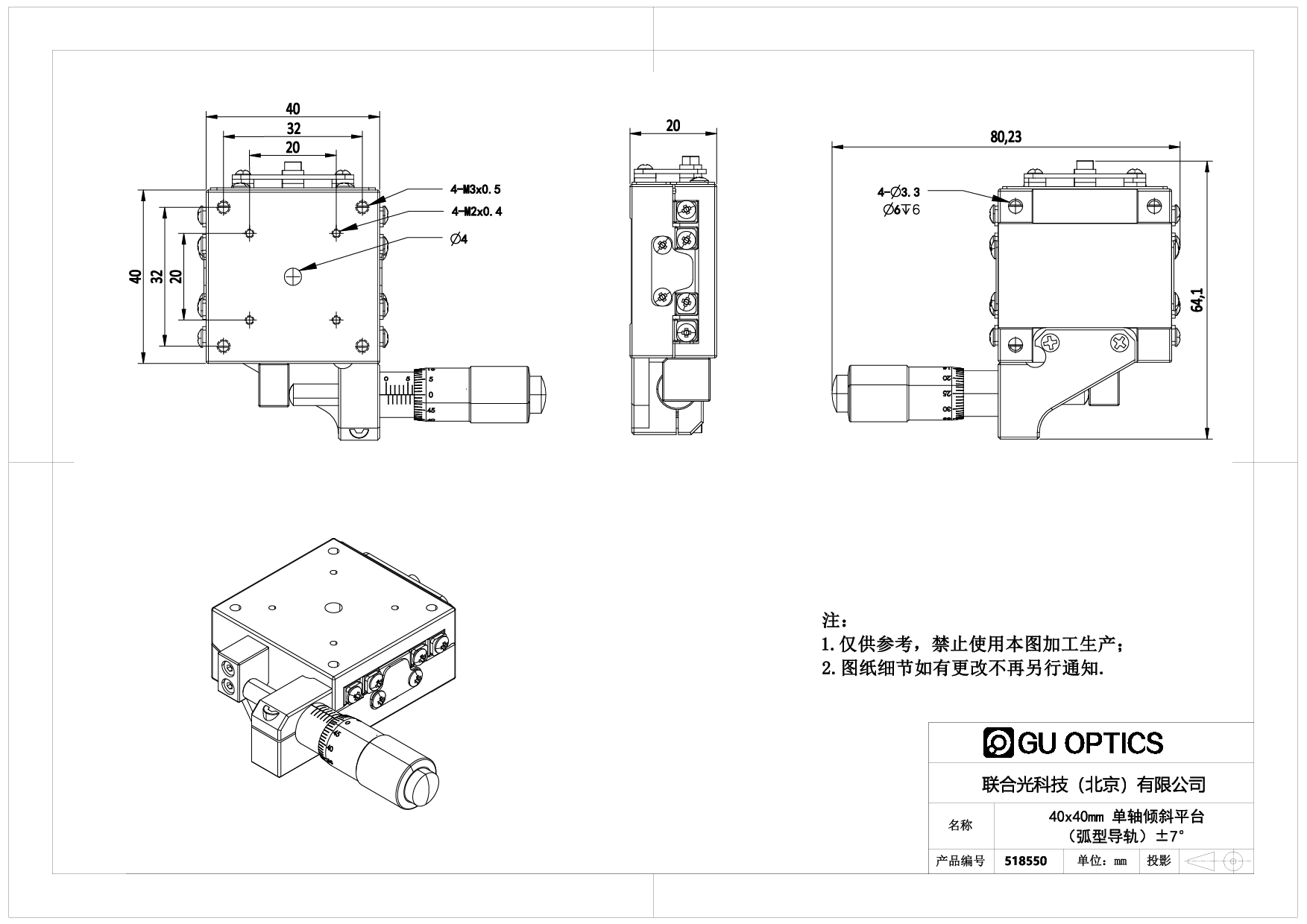 40x40mm 单轴倾斜平台(弧型导轨)±7°