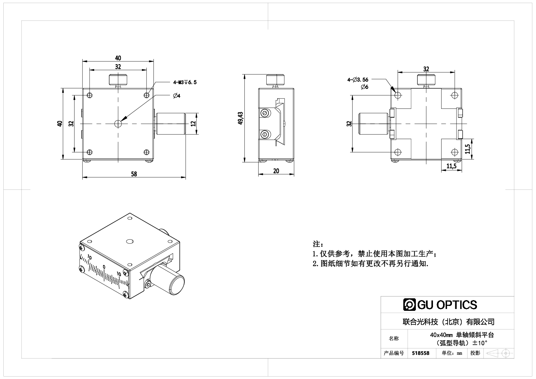 40x40mm 单轴倾斜平台(铜合金燕尾式)±10°