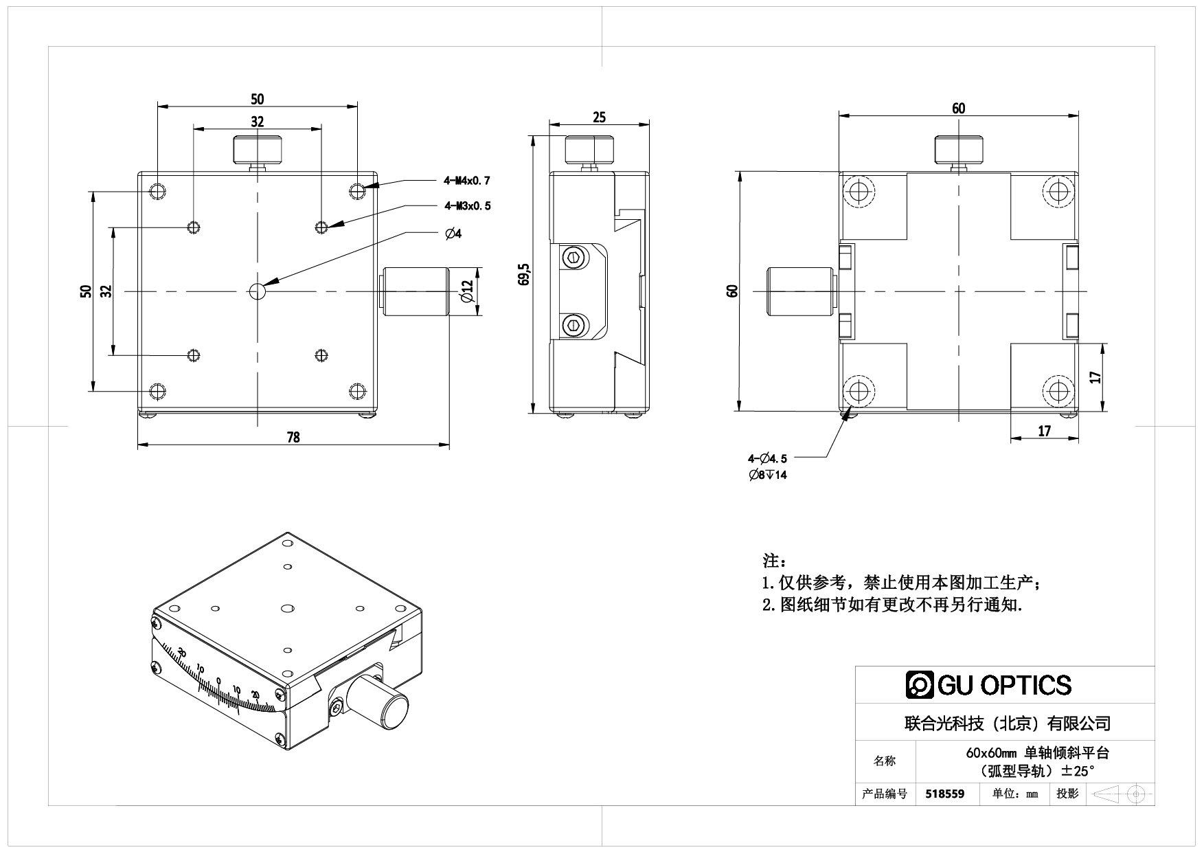 60x60mm 单轴倾斜平台(铜合金燕尾式)±25°