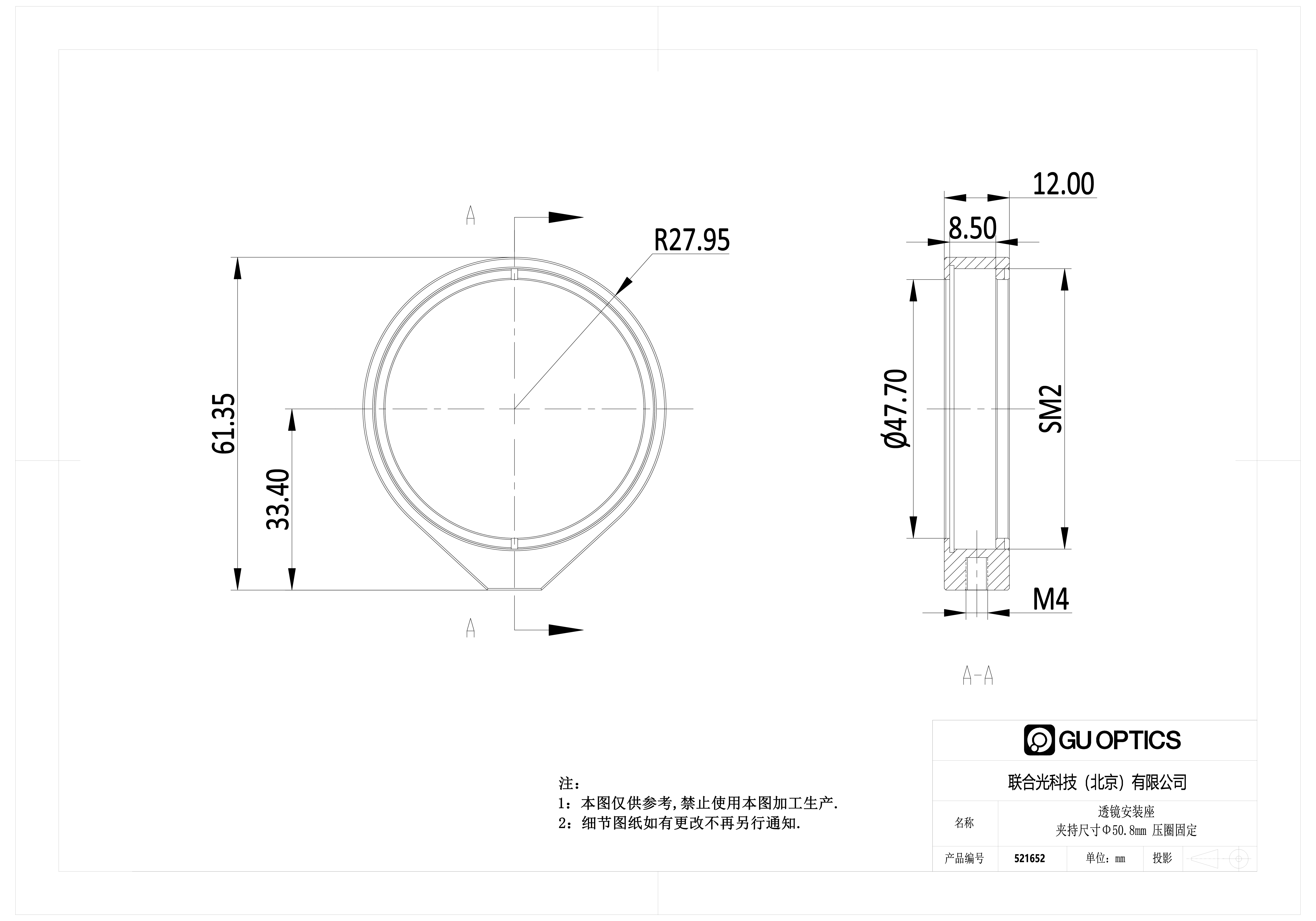 透镜安装座是一体化设计,既美观又实用,同时有降低了使用成本。透镜安装座的安装卡槽带有标准的内螺纹口,同时标配一个配套的压圈,用于安装固定透镜等光学元件。