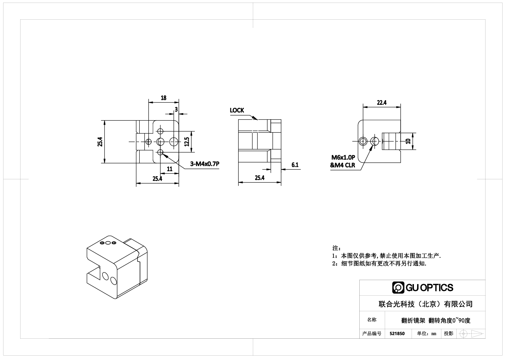 联合光科的翻折镜座,提供0°和180°翻折两种规格的镜座,与光学调整架配合使用可以用于不同角度的光束转向。