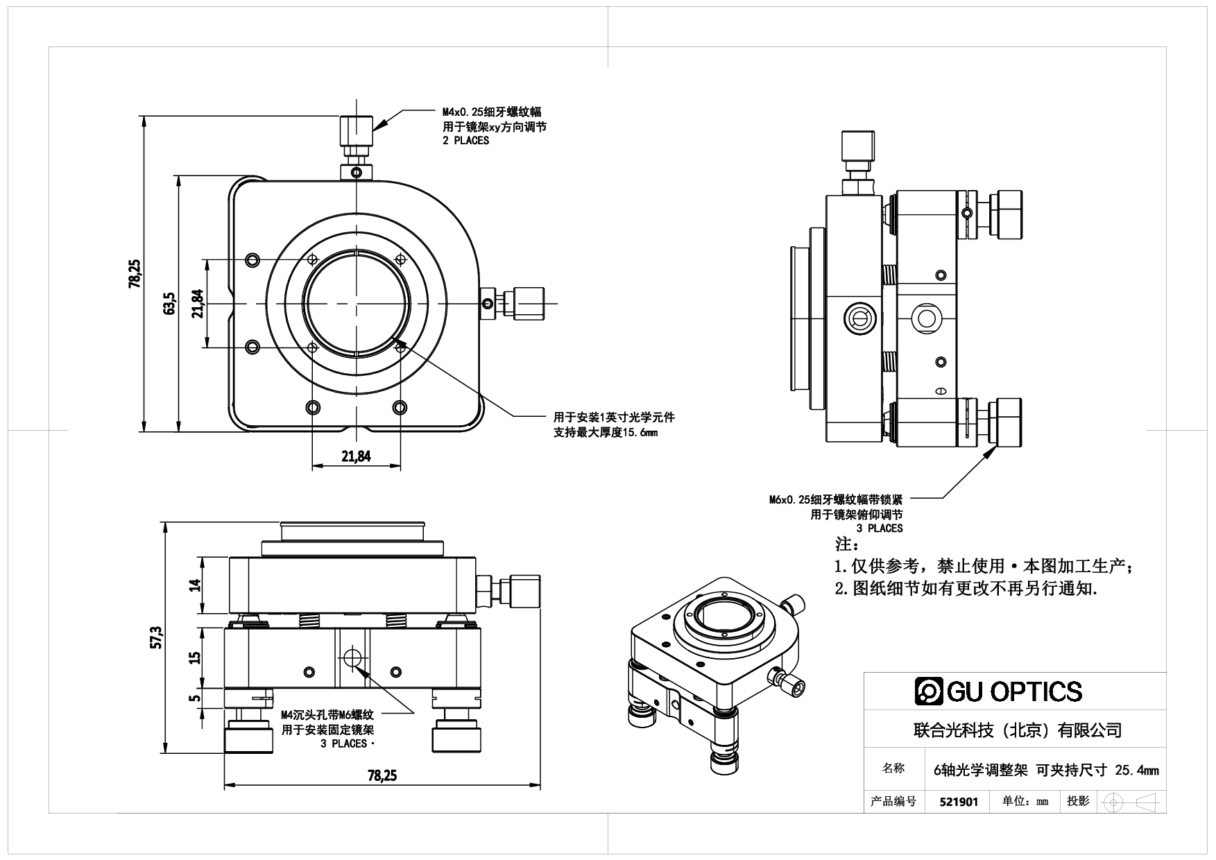 3. 尺寸紧凑,用于安装最厚8mm,Φ25.4 mm光学元件,压圈固定;