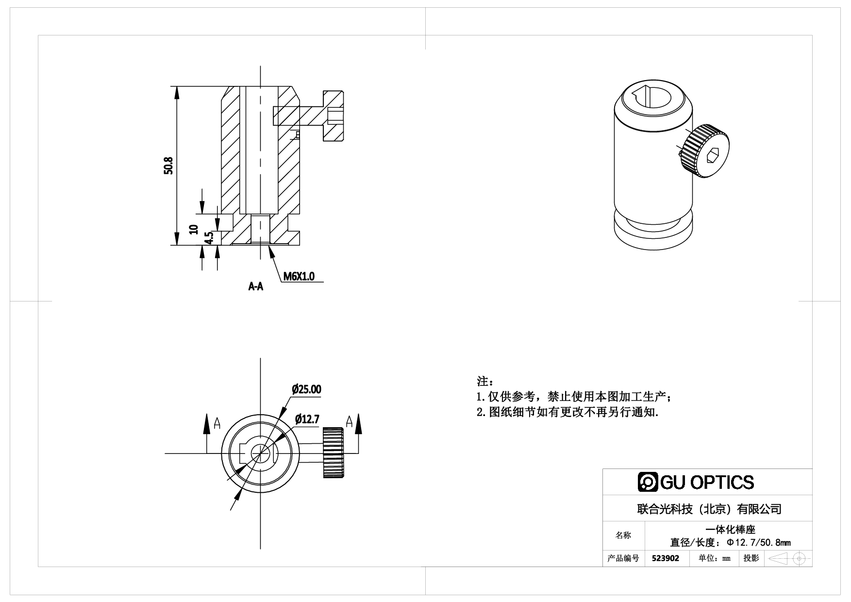 一体式棒座(One Piece Optical Post Holder)支撑座的底端具有M6螺纹牙孔,可轻松地固定于各种基座、光学桌和面包板上,所有的支撑座都配有一个螺丝旋钮用来固定支撑棒。 支撑座都配有一个定位弹簧钢珠和螺丝旋钮可以坚固和稳定地固定支撑棒,从顶端到底部的方型槽设计,可以再螺丝旋钮固定时,形成三点共面的稳定性。各种长度的支撑座和不同高度的支撑棒组合,能在各种应用领域上达到所需的任意高度。配合小型叉式棒座压条523601使用。联合光科可提供内部直径12.7mm、五种长度(25.4mm~101.6mm)的标准现货产品供您选择。