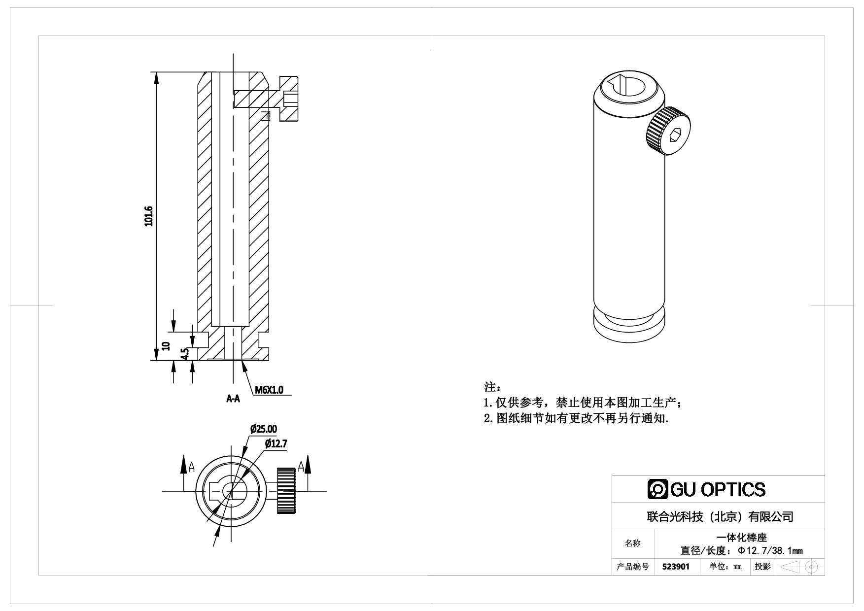 一体式棒座(One Piece Optical Post Holder)支撑座的底端具有M6螺纹牙孔,可轻松地固定于各种基座、光学桌和面包板上,所有的支撑座都配有一个螺丝旋钮用来固定支撑棒。 支撑座都配有一个定位弹簧钢珠和螺丝旋钮可以坚固和稳定地固定支撑棒,从顶端到底部的方型槽设计,可以再螺丝旋钮固定时,形成三点共面的稳定性。各种长度的支撑座和不同高度的支撑棒组合,能在各种应用领域上达到所需的任意高度。配合小型叉式棒座压条523601使用。联合光科可提供内部直径12.7mm、五种长度(25.4mm~101.6mm)的标准现货产品供您选择。