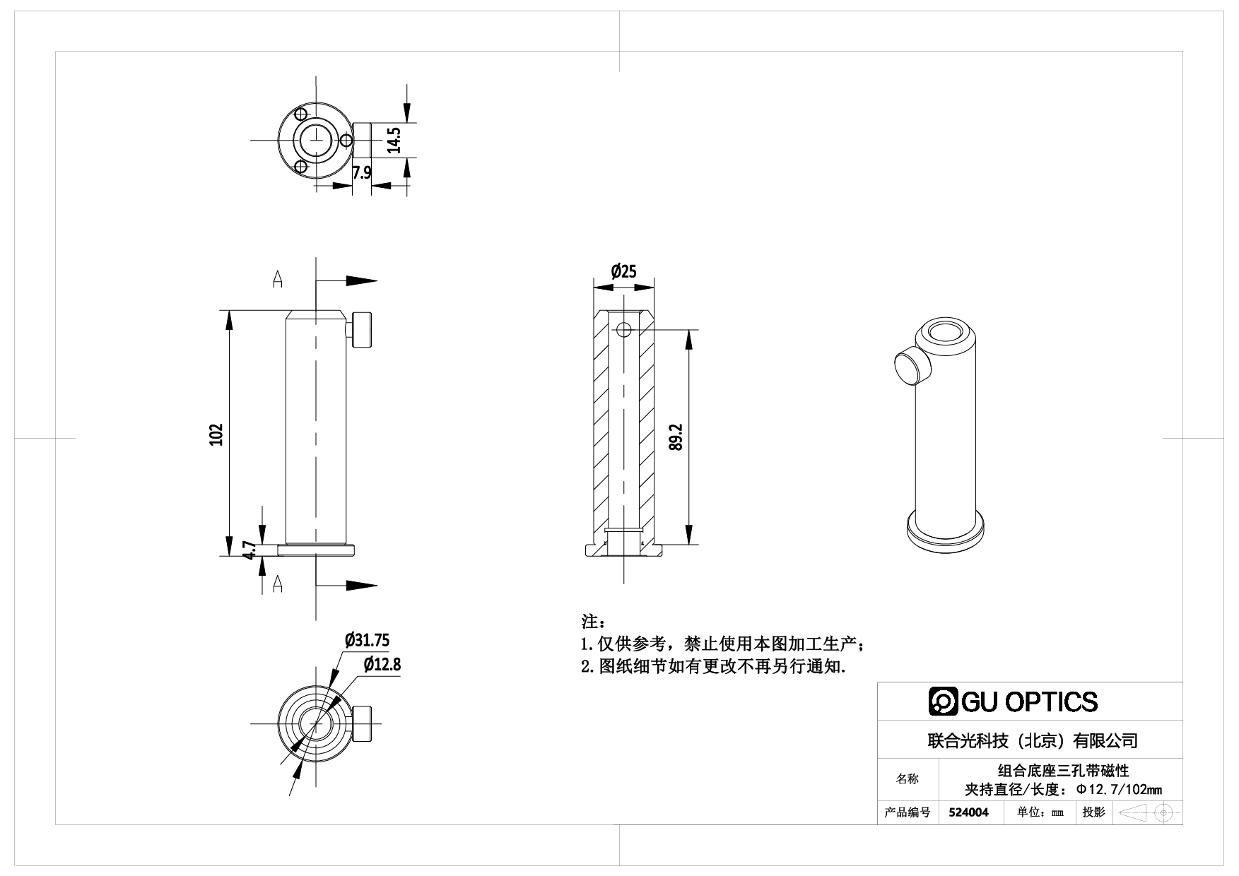 组合底座三孔带磁性棒座 高度=102mm