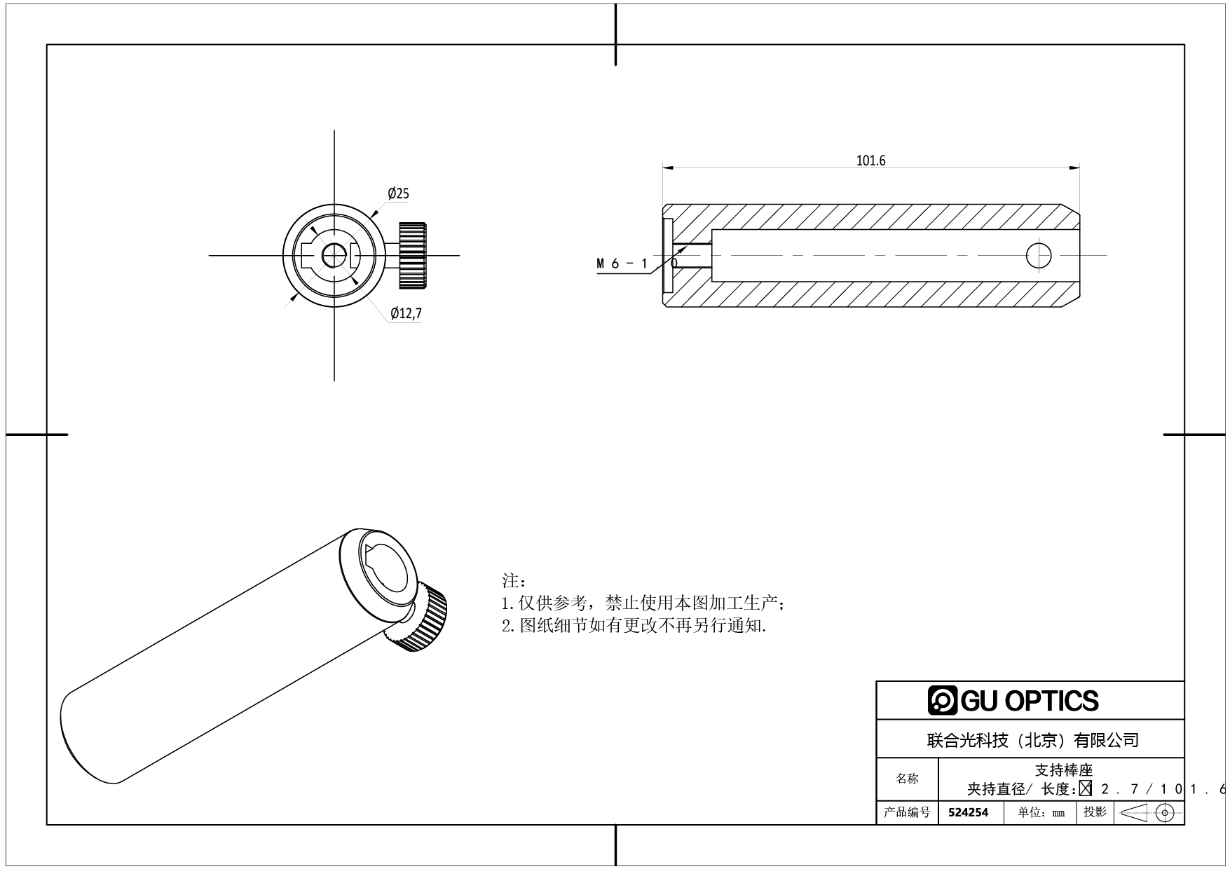 支撑棒座(Mounting Post Holder)的底端具有M6螺纹牙孔,可轻松地固定于各种基座、光学桌和面包板上,所有的支撑座都配有一个螺丝旋钮用来固定支撑棒。所有的支撑座都配有一个定位弹簧钢珠和螺丝旋钮可以坚固和稳定地固定支撑棒,从顶端到底部的方型槽设计,可在螺丝旋钮固定时,形成三点共面的稳定性。各种长度的支撑座和不同高度的支撑棒组合,能在各种应用领域上达到所需的任意高度。建议最大扭力:30kgf-cm,配合叉式棒座压条523600和支撑棒基座523750使用。请注意:我们不建议用L型六角板手来转动螺丝旋钮固定,因为非常有可能会扭断旋钮而损坏。