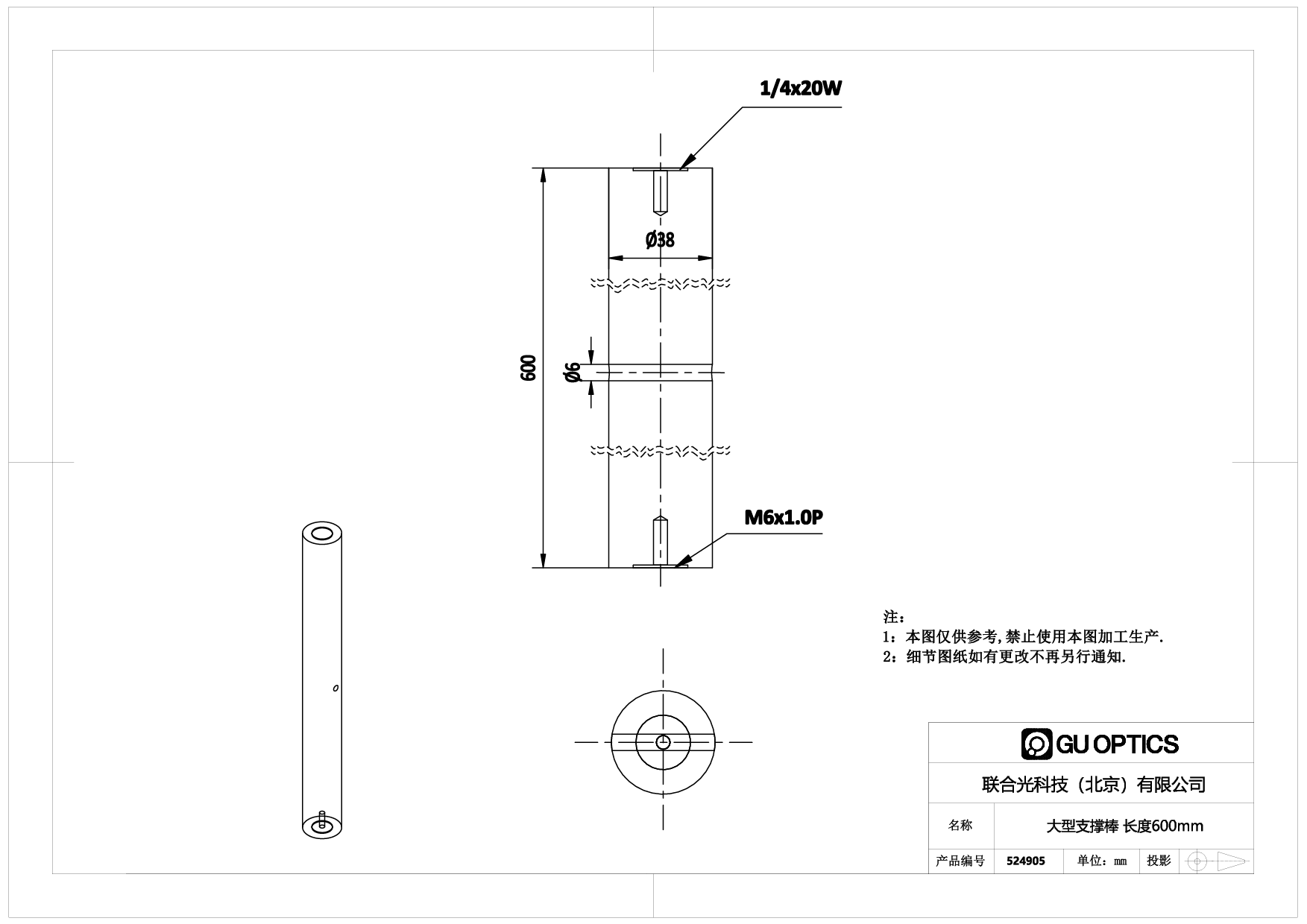 联合光科的大型支撑棒直径38mm,不同长度的支撑棒供您选择:75mm-600mm。支撑棒两端带有M6螺纹孔,可以方便的将不同长度的支撑棒交叉组合使用,可以达到您理想的高度。大型支撑棒可以与大型支撑棒基座配合使用,可以方便快捷的固定在光学平台上,也可以与大型支撑棒夹持器搭配使用,方便简洁,提供光学安装面。联合光科可为您提供配套的光机元件,同时我们有大量的标准库现货供应。联合光科衷心期望在您构建光学实验系统的过程中,能为您提供简洁、经济、快捷的手段,并方便您使用过程中快捷的进行元件替换和调整。