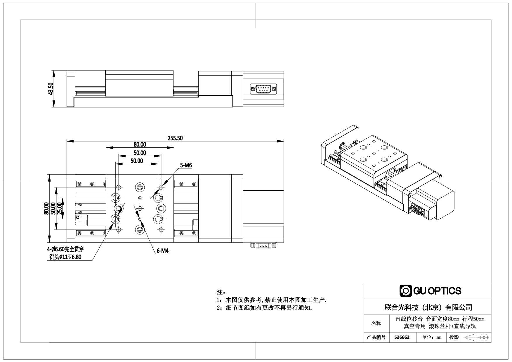 直线位移台 台面宽度80mm 行程50mm 真空专用 滚珠丝杆+直线导轨