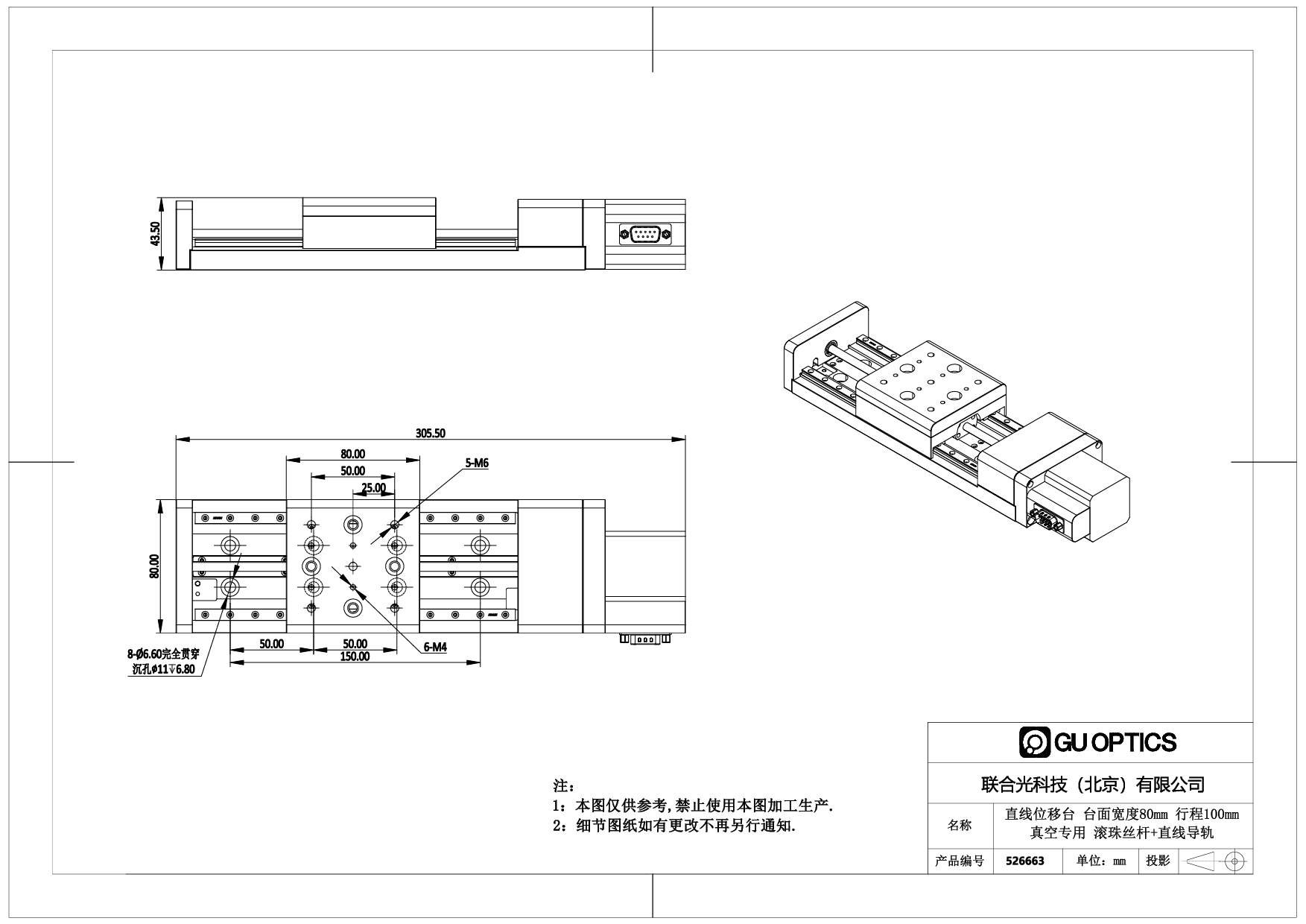 直线位移台 台面宽度80mm 行程100mm 真空专用 滚珠丝杆+直线导轨