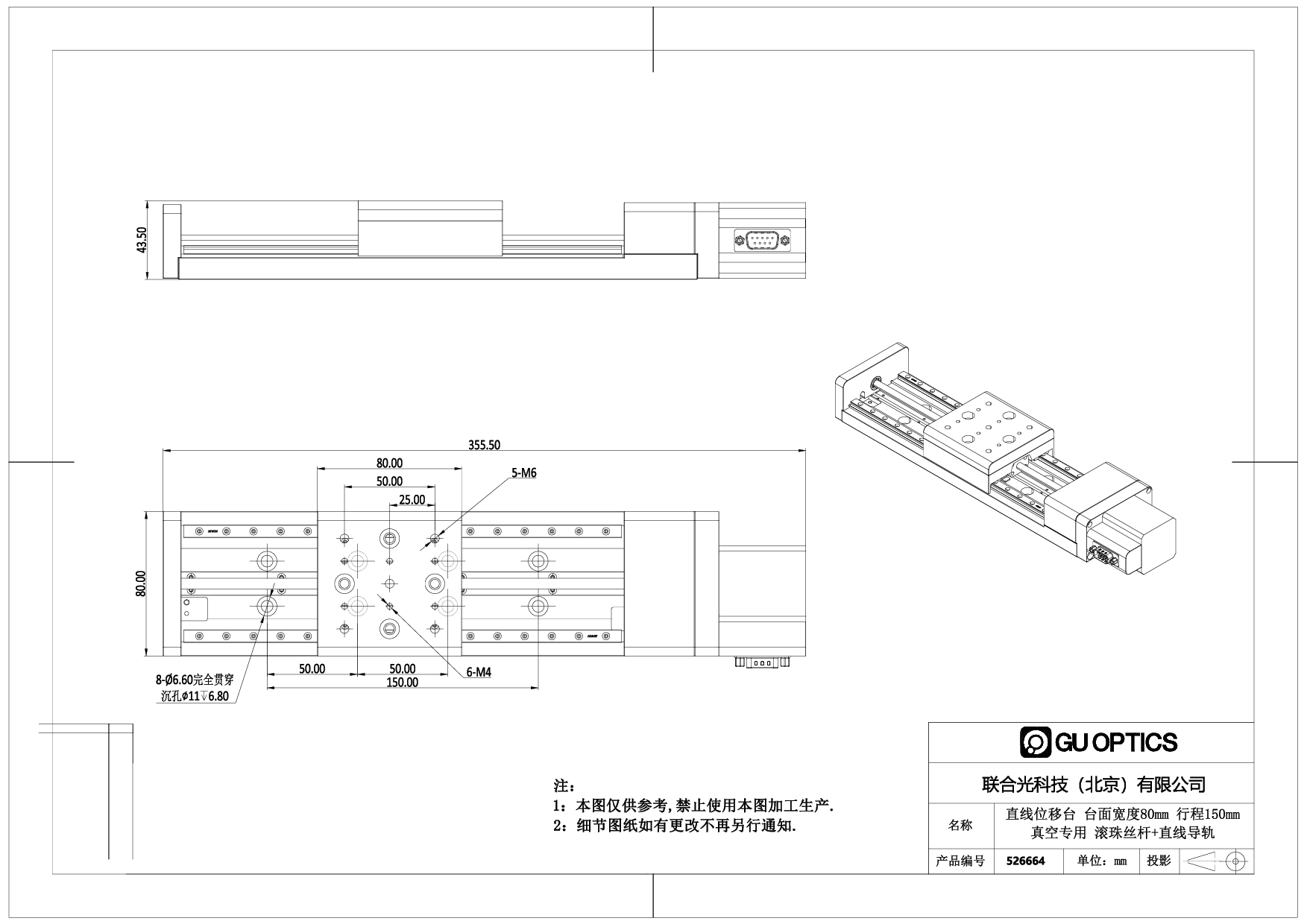 直线位移台 台面宽度80mm 行程150mm 真空专用 滚珠丝杆+直线导轨