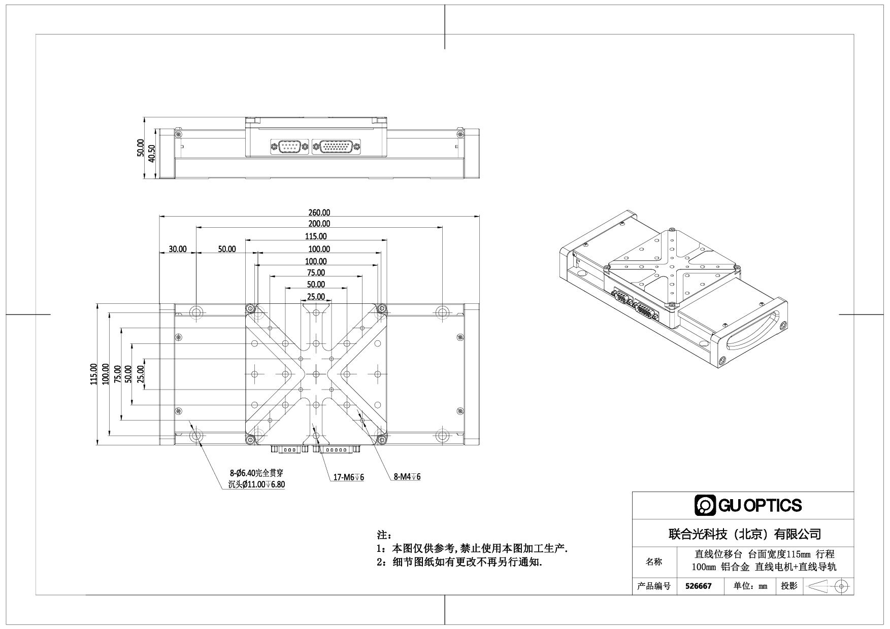 直线位移台 台面宽度115mm 行程100mm 铝合金 直线电机+直线导轨